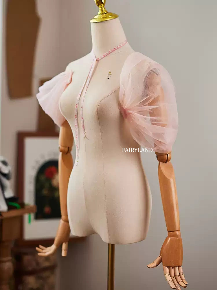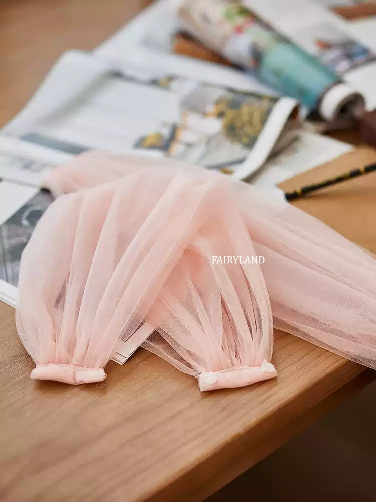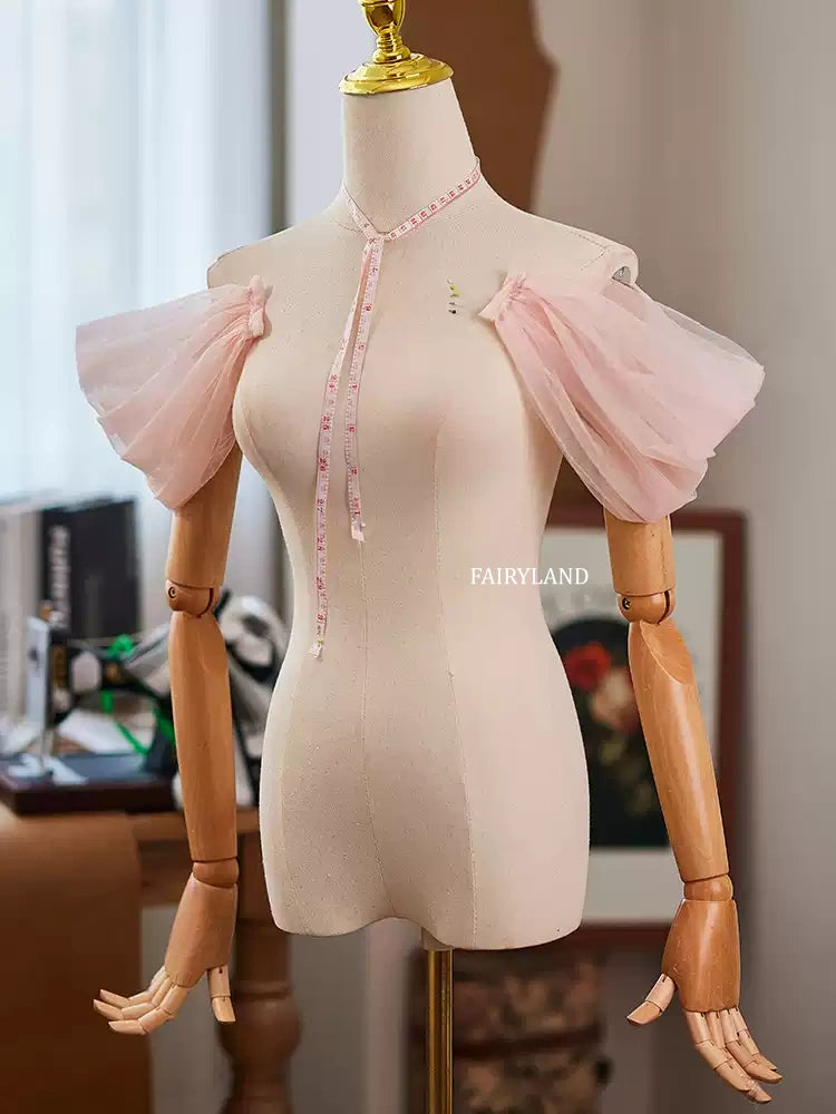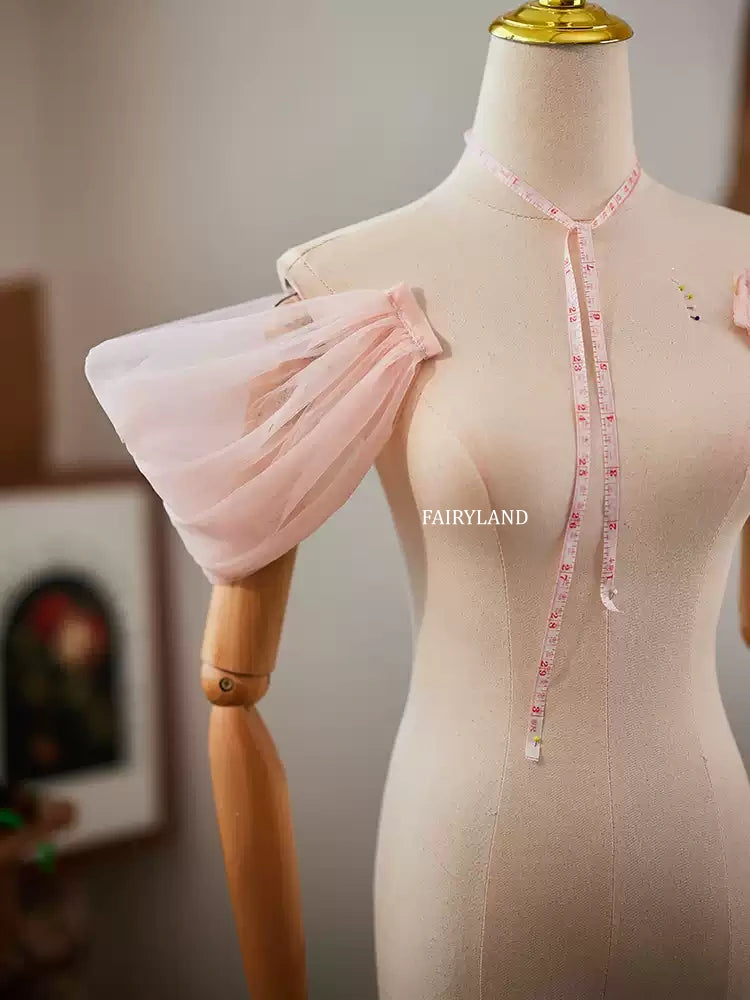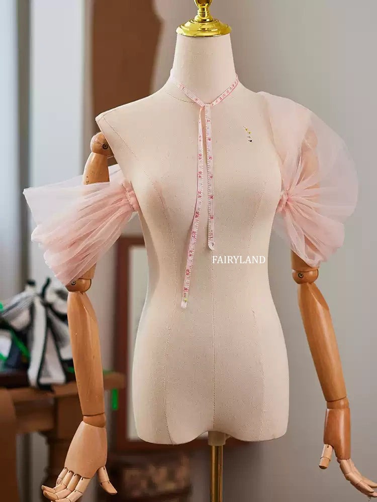 These delicate blush tulle puff sleeves bring a soft, romantic touch to any bridal or editorial look. Designed as removable arm accessories, they effortlessly elevate simple gowns, bodysuits, or photoshoot outfits with airy volume and feminine charm.