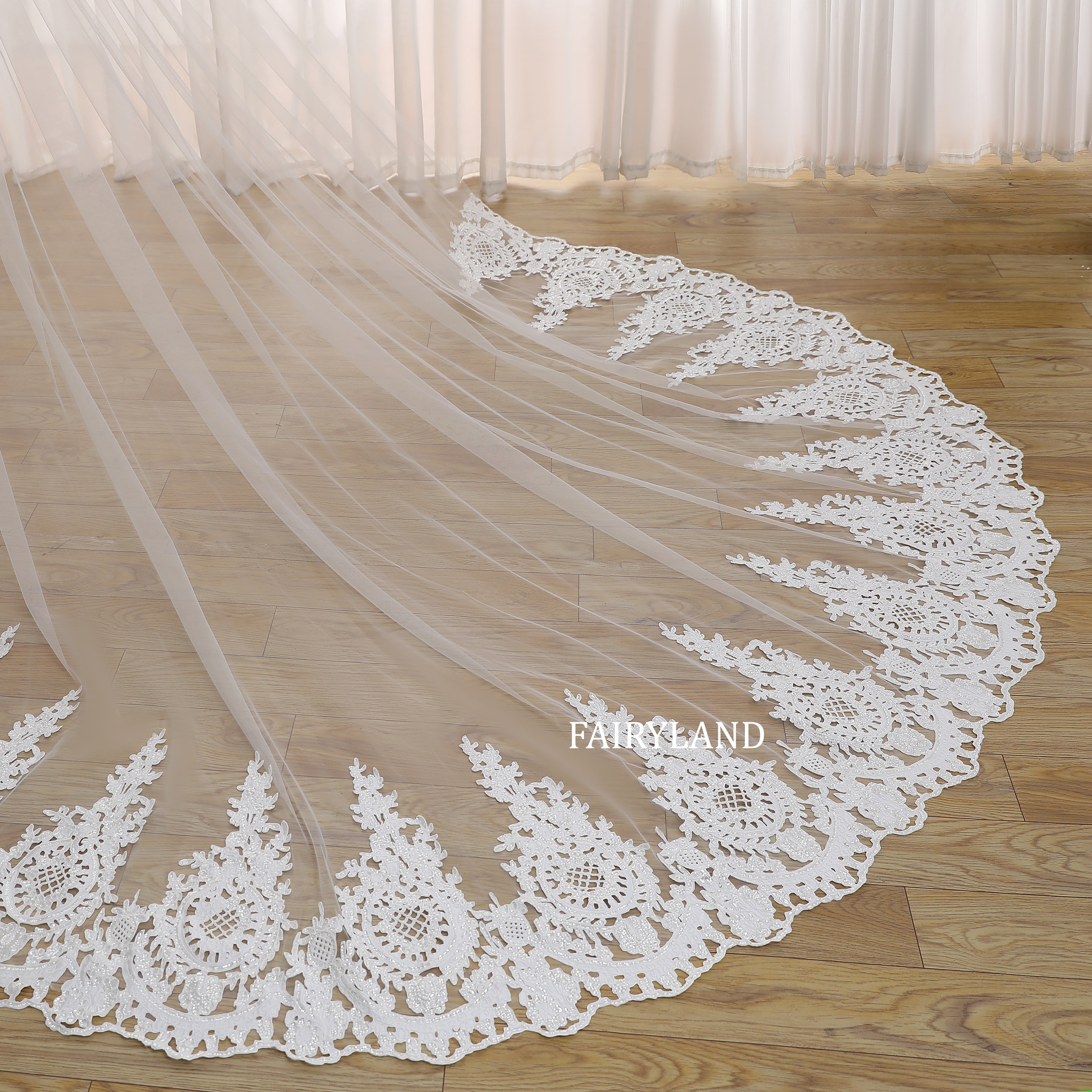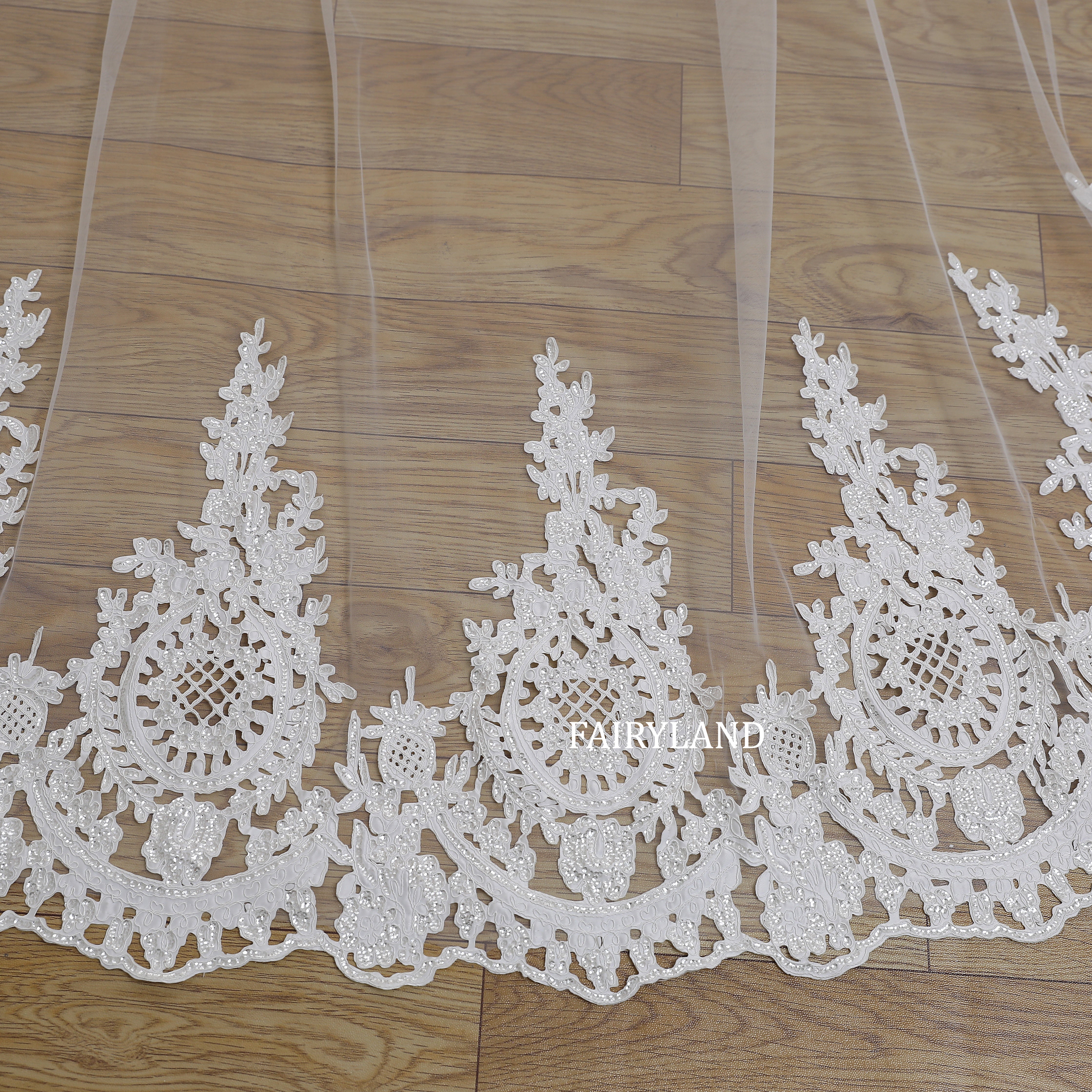 The highlight of this veil is its exquisite scalloped lace appliqué edge, featuring intricate floral embroidery that frames the bride beautifully during the ceremony and photos. The lightweight fabric drapes effortlessly, offering movement that feels dreamy and ethereal.