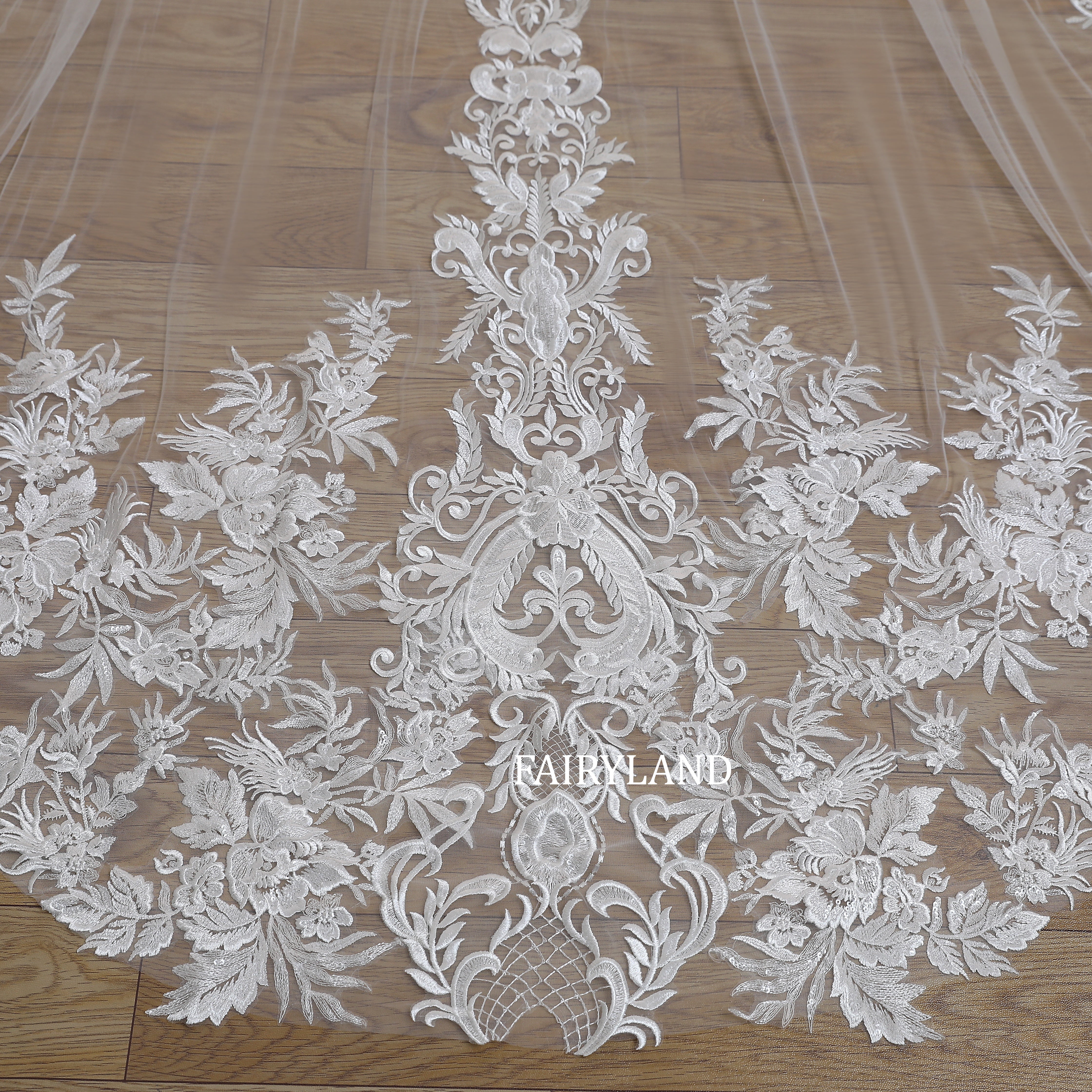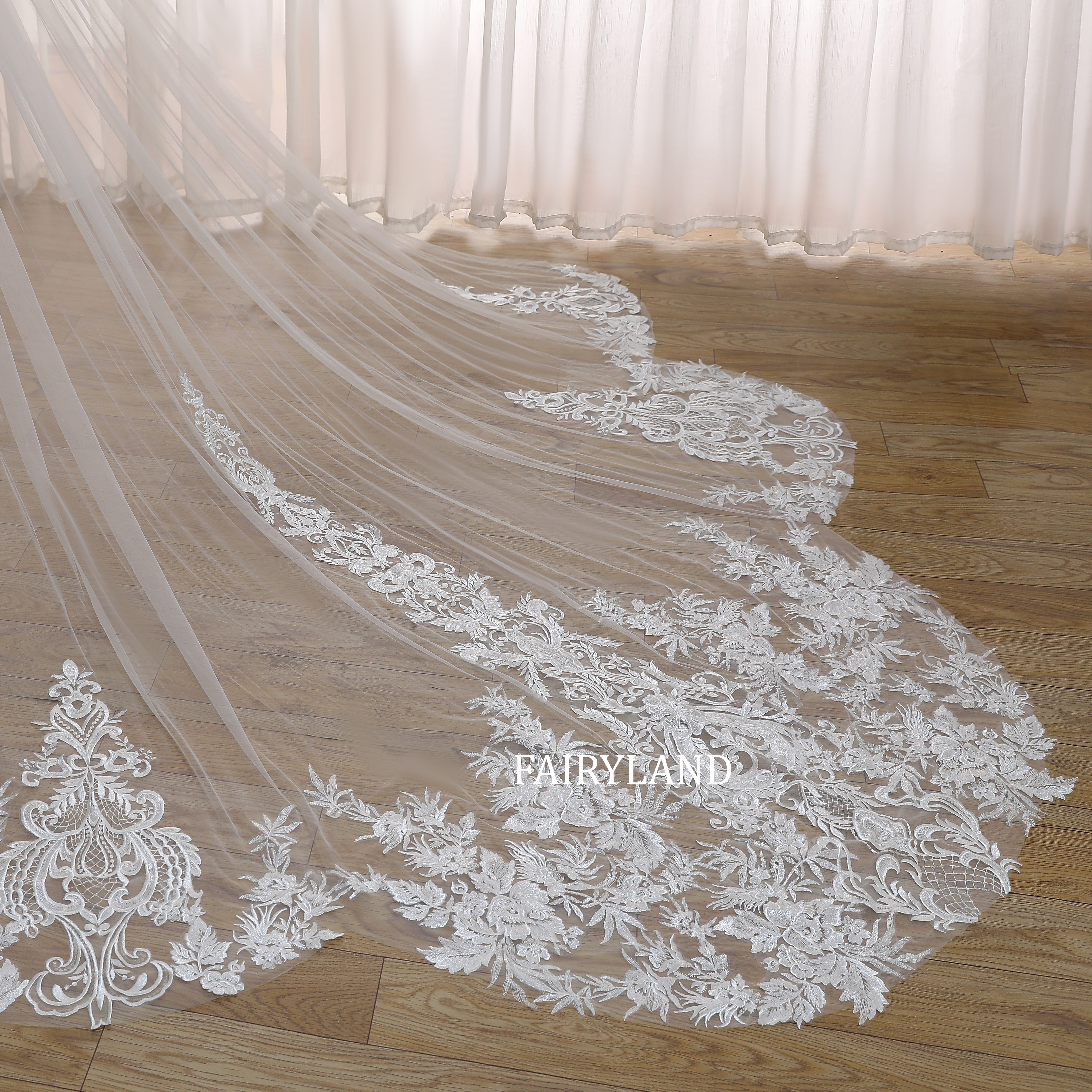 This Cathedral Length Lace Appliqué Wedding Veil is the epitome of timeless bridal elegance. Crafted from ultra-soft sheer tulle, it features intricate floral lace embroidery that gracefully frames the edge and cascades down the train. The classic cathedral length adds drama and sophistication, making every step down the aisle breathtaking. Lightweight and flowing, this veil perfectly complements any gown — from modern minimalist to romantic lace designs. Designed to make your wedding day truly unforgettable.