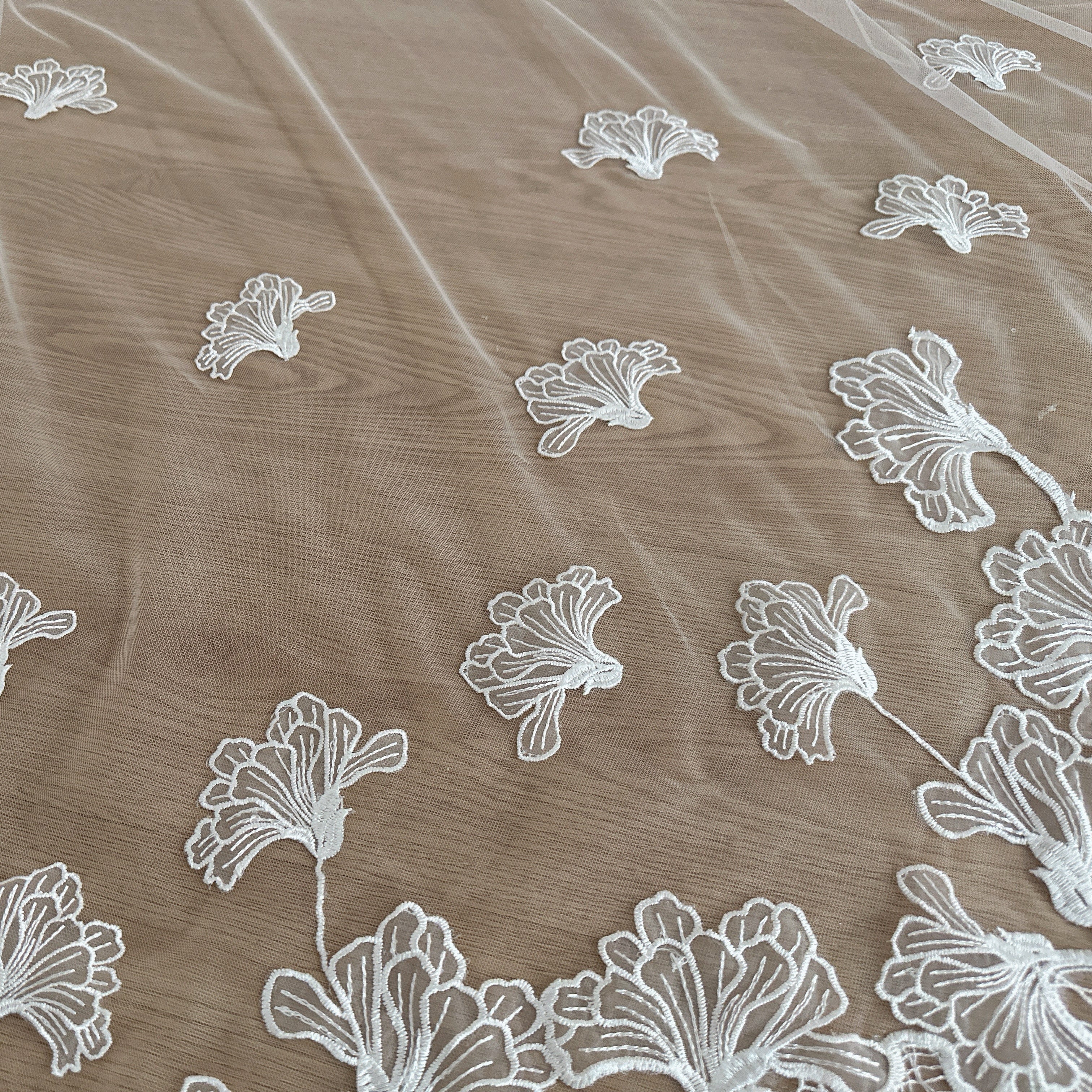 The veil features an exquisitely embroidered lace edge with delicate floral motifs, complemented by scattered floral appliqués throughout the train. The refined detailing adds depth and texture while remaining light and graceful, making it the perfect finishing touch for a classic or modern bridal look.