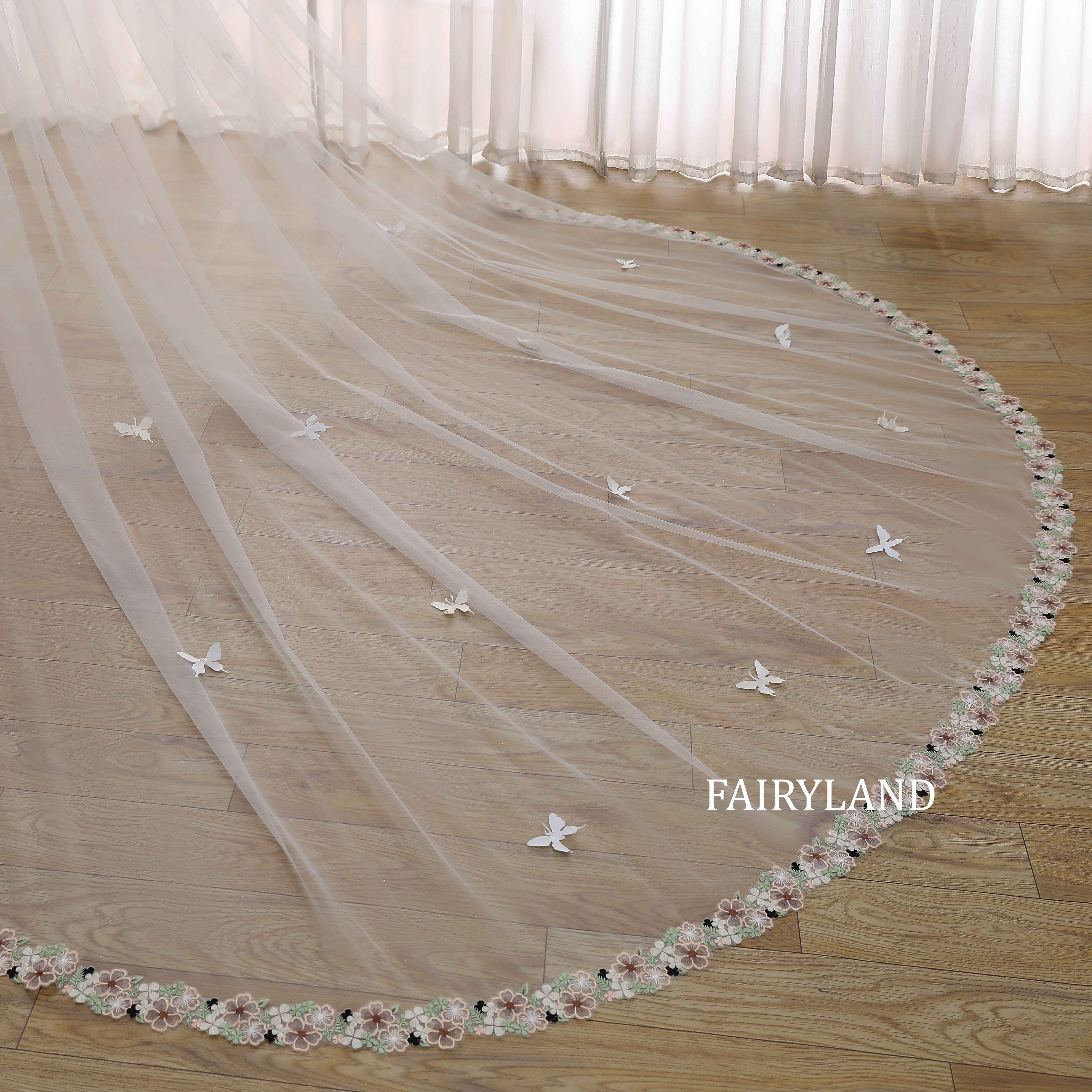 Step into a fairy-tale moment with the FAIRYLAND Cathedral Length Wedding Veil adorned with 3D Butterflies and Floral Lace Edge.