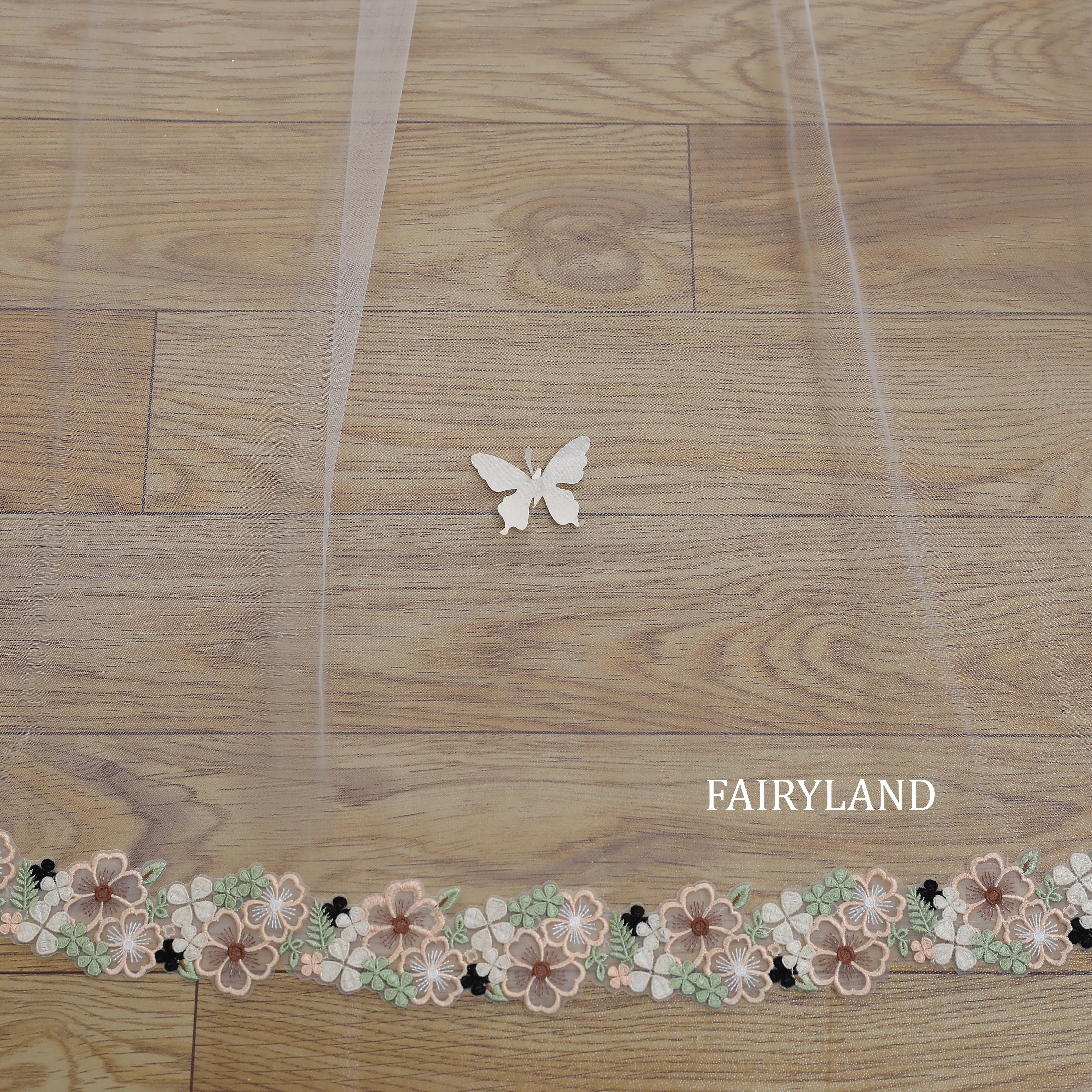 This ethereal veil is crafted from soft, lightweight ivory tulle and beautifully decorated with delicate butterfly appliqués that seem to flutter as you move. The edge features pastel floral embroidery, adding a touch of color and romance to your bridal look.