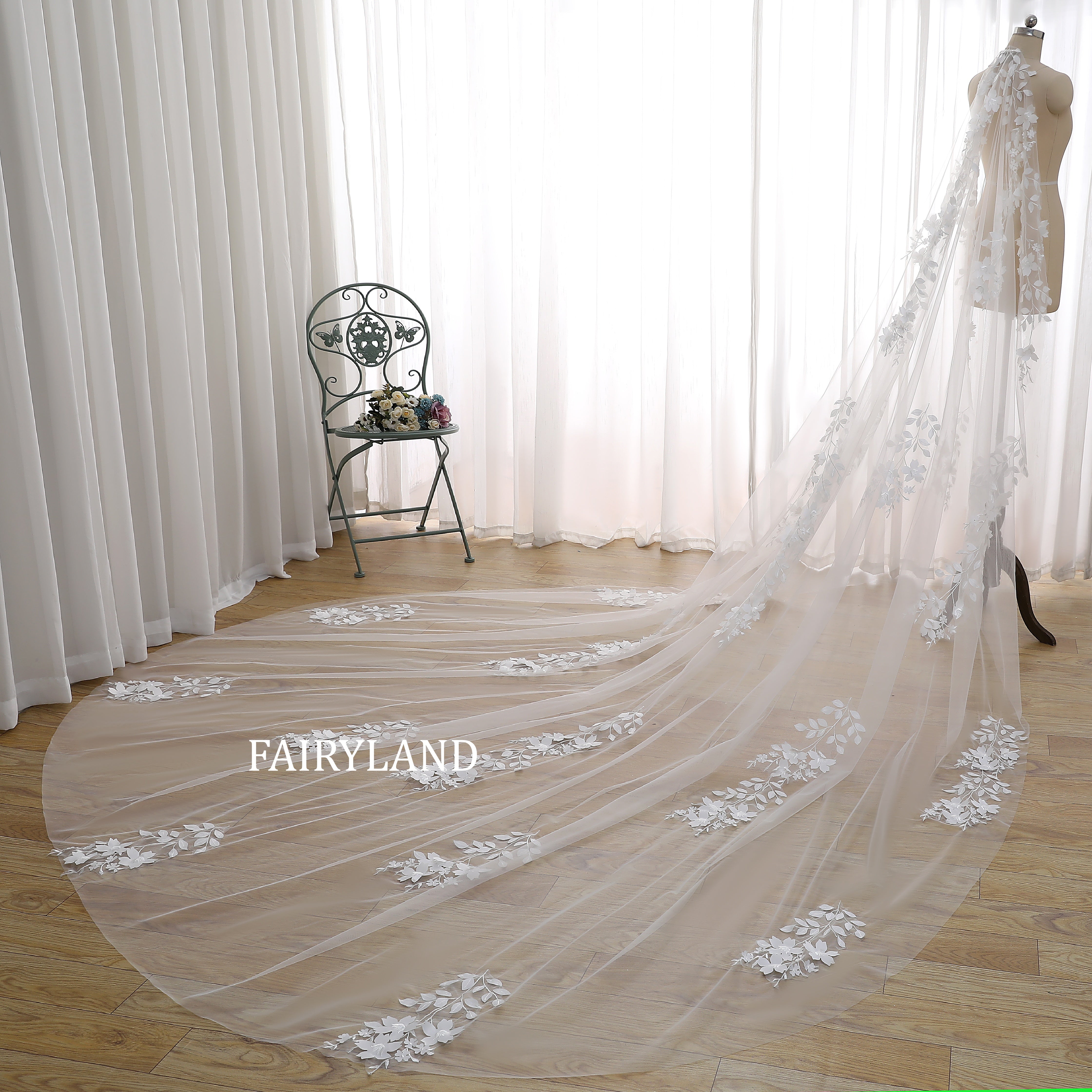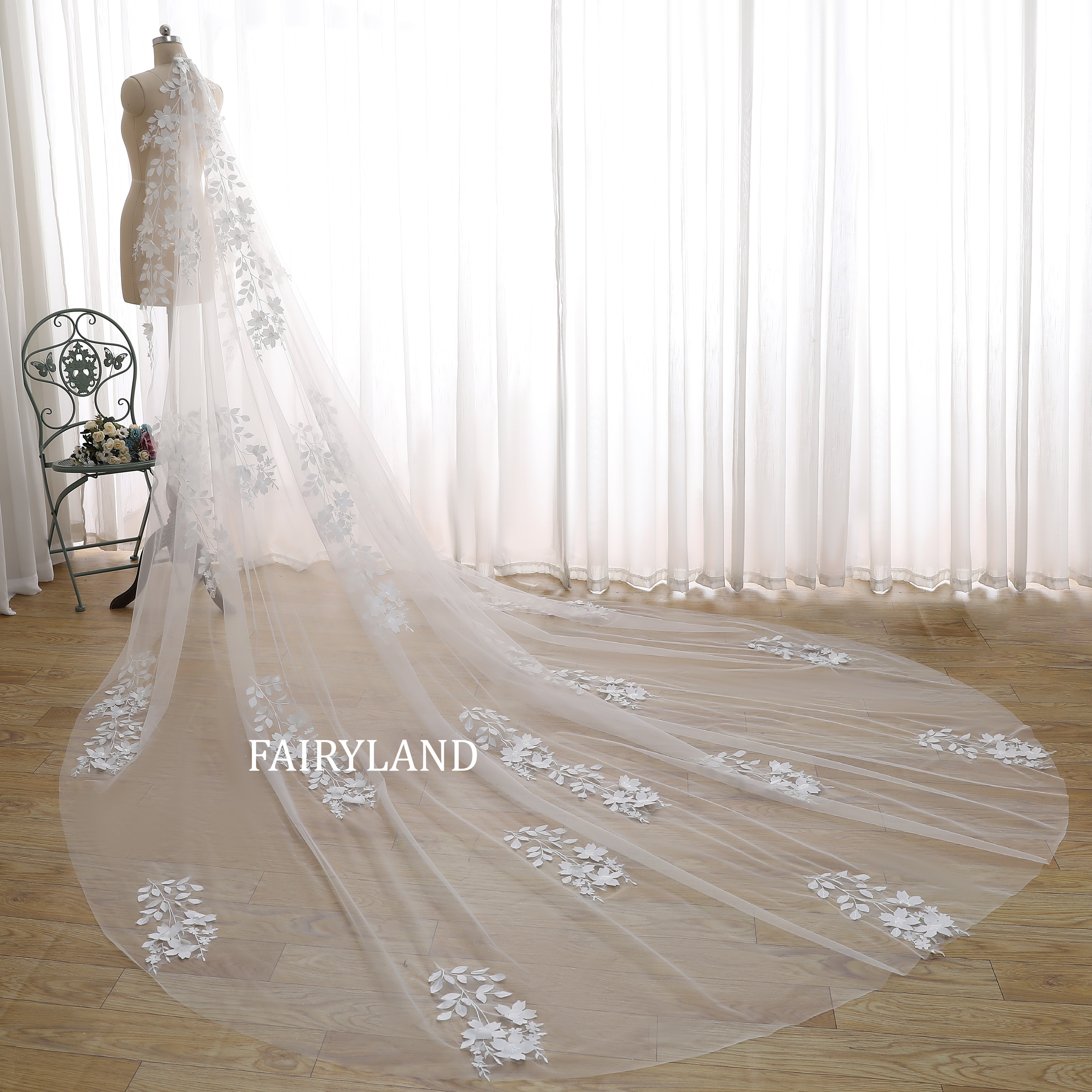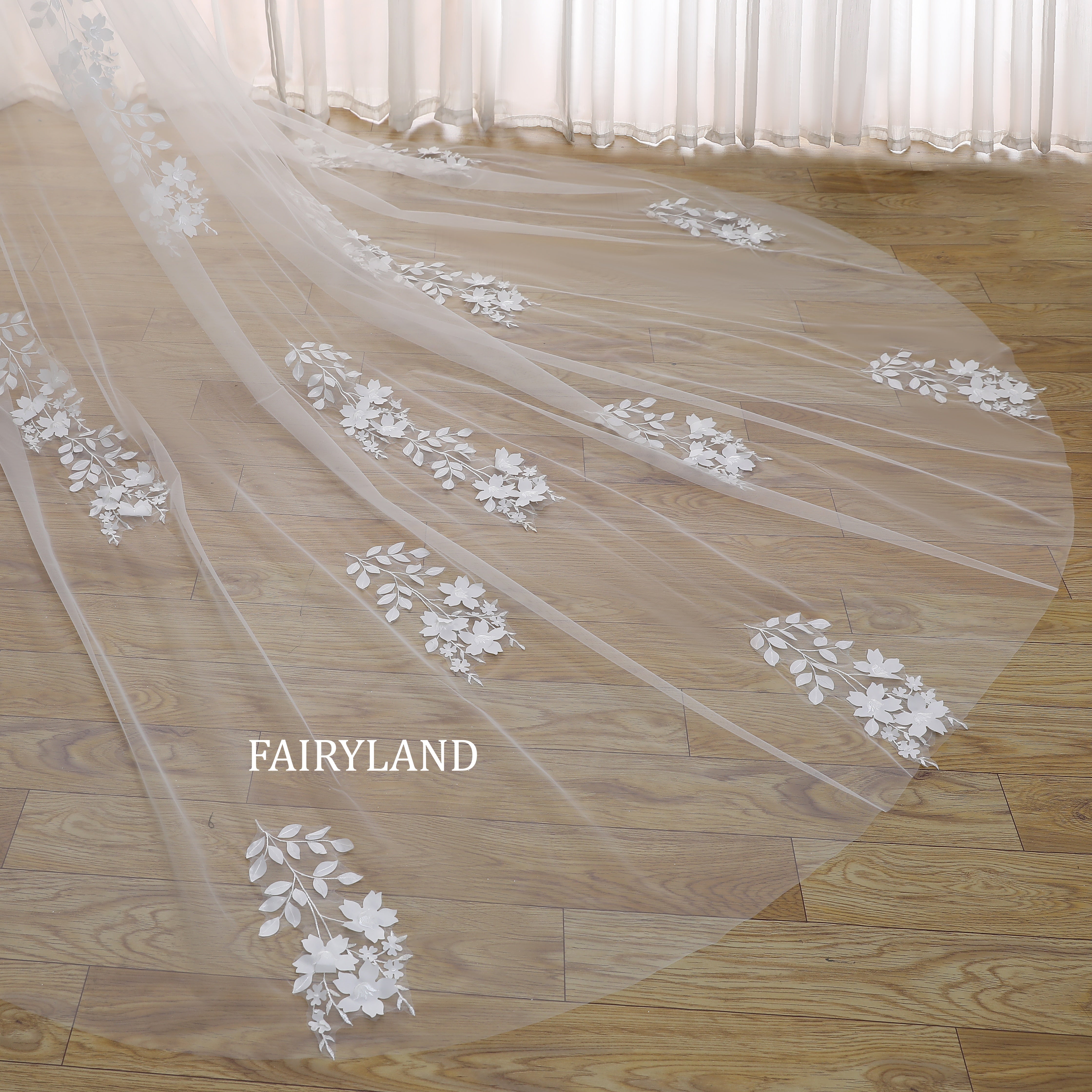 Add a touch of natural elegance to your wedding day with the FAIRYLAND Cathedral Length Wedding Veil featuring exquisite leaf embroidery. Crafted from premium soft ivory tulle, this long bridal veil flows gracefully with every movement, creating a dreamy and ethereal look. The intricate white leaf appliqué patterns are delicately arranged throughout the veil, symbolizing growth, love, and harmony. Lightweight, sheer, and easy to wear, this veil complements both modern and classic wedding gowns. Perfect for brides seeking a sophisticated and timeless accessory that enhances their bridal beauty without overpowering the dress. Ideal for church weddings, outdoor ceremonies, or romantic garden photoshoots, this veil captures effortless grace and natural charm.