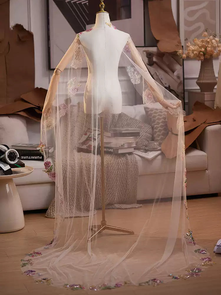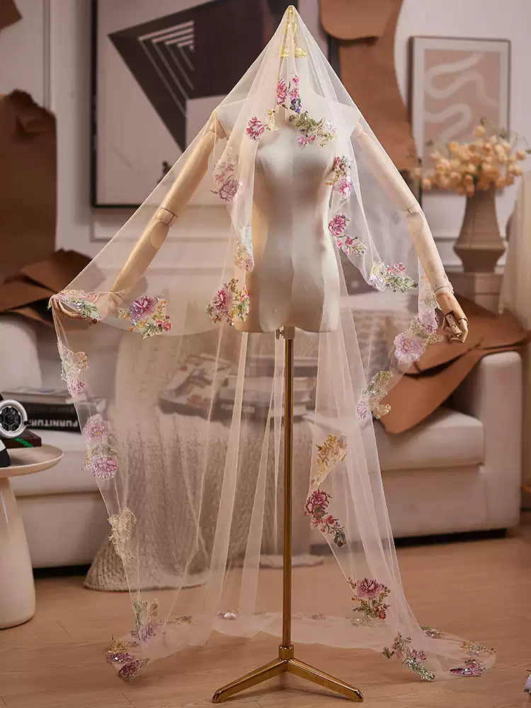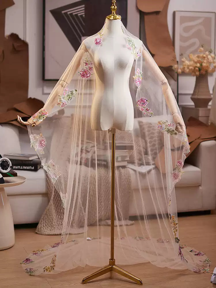 Elevate your bridal look with this romantic embroidered tulle bridal cape veil. Crafted from soft, lightweight sheer tulle, this long wedding cape drapes effortlessly over the shoulders and flows into a graceful train. Delicate floral appliqués are scattered along the edges, adding subtle color, texture, and an ethereal garden-inspired charm.