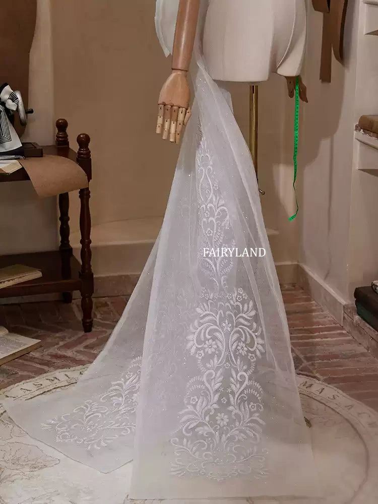 The bow features soft shimmering textures, while the trailing panel showcases intricate floral embroidery that catches light beautifully from every angle. Perfect for brides seeking a sophisticated, ethereal, and photogenic statement piece.