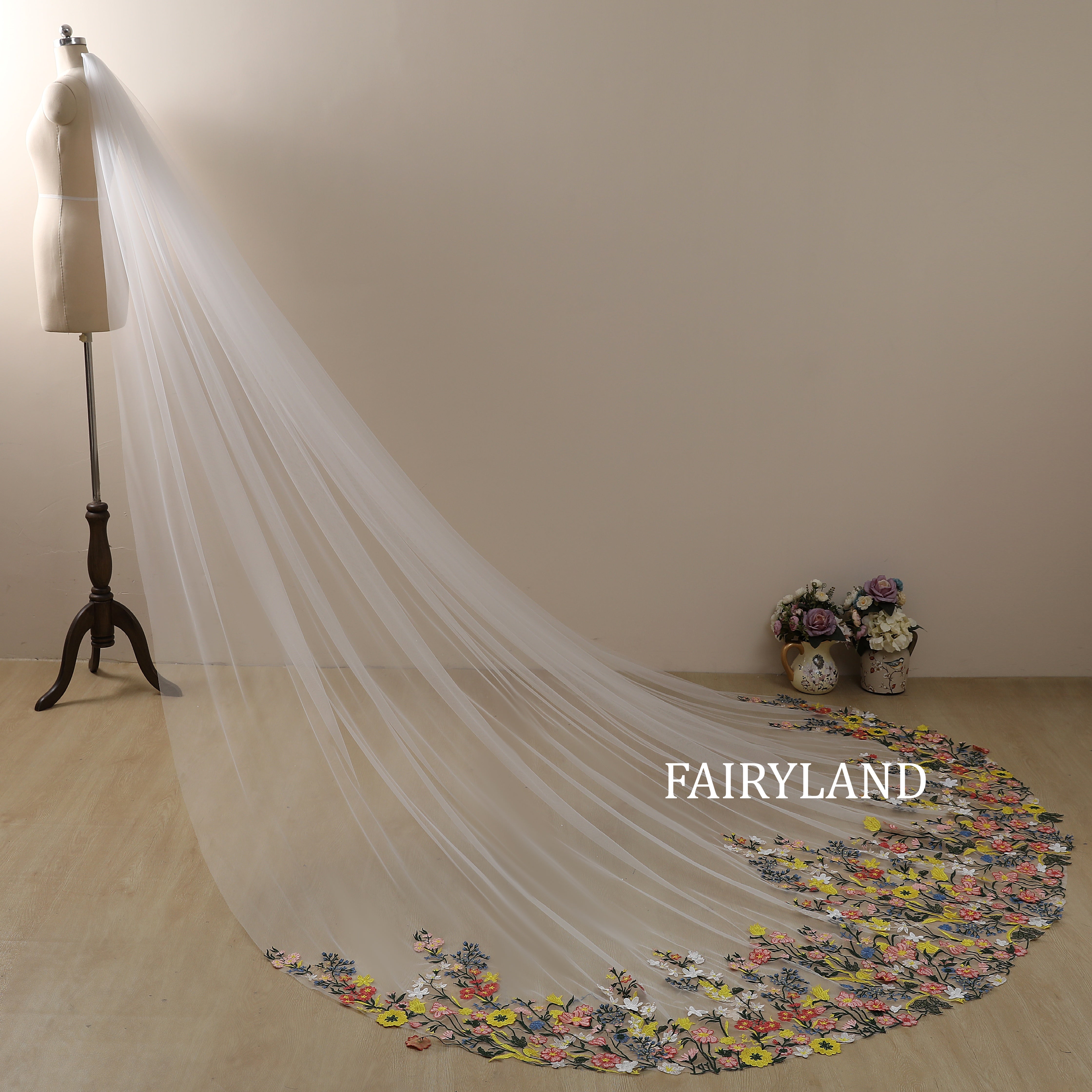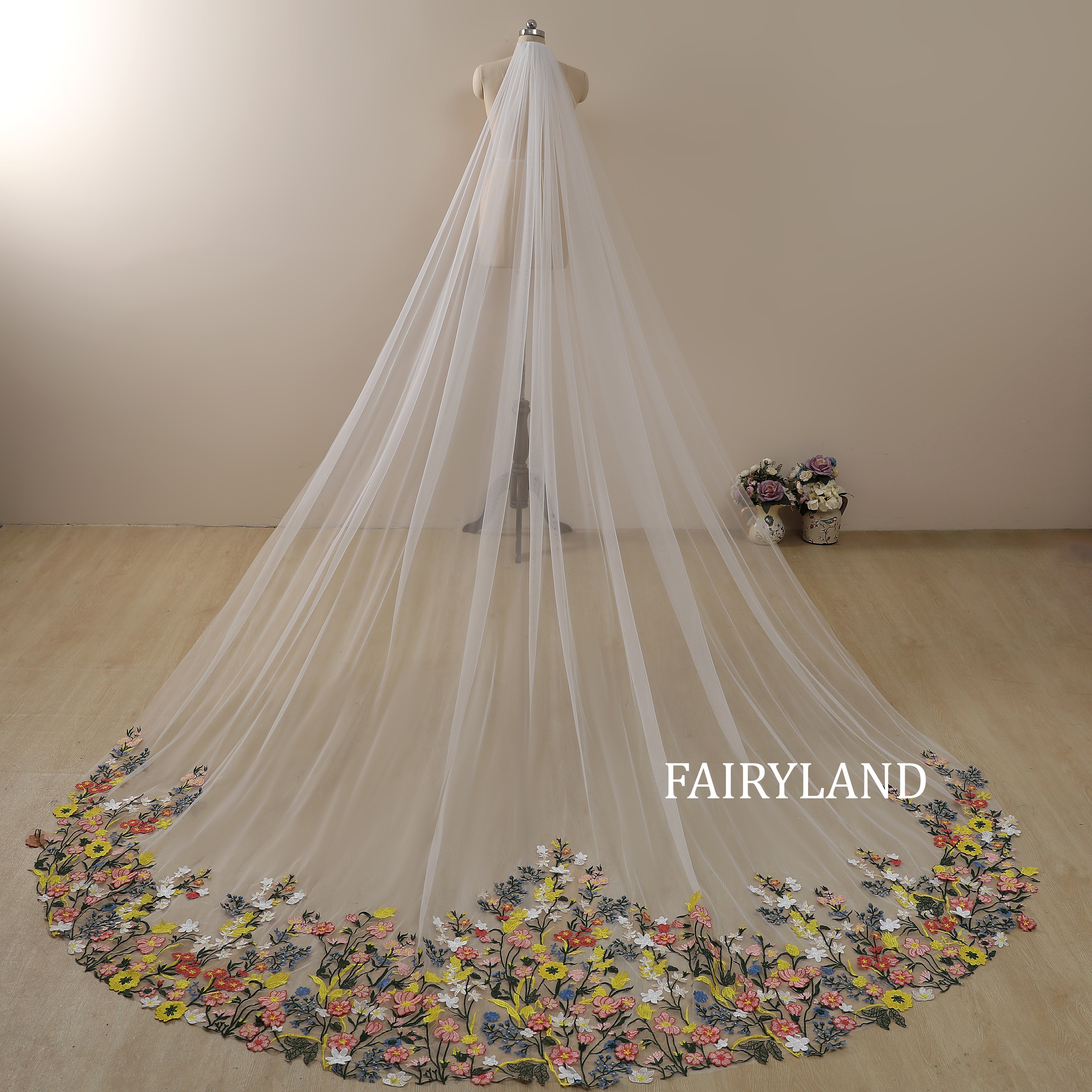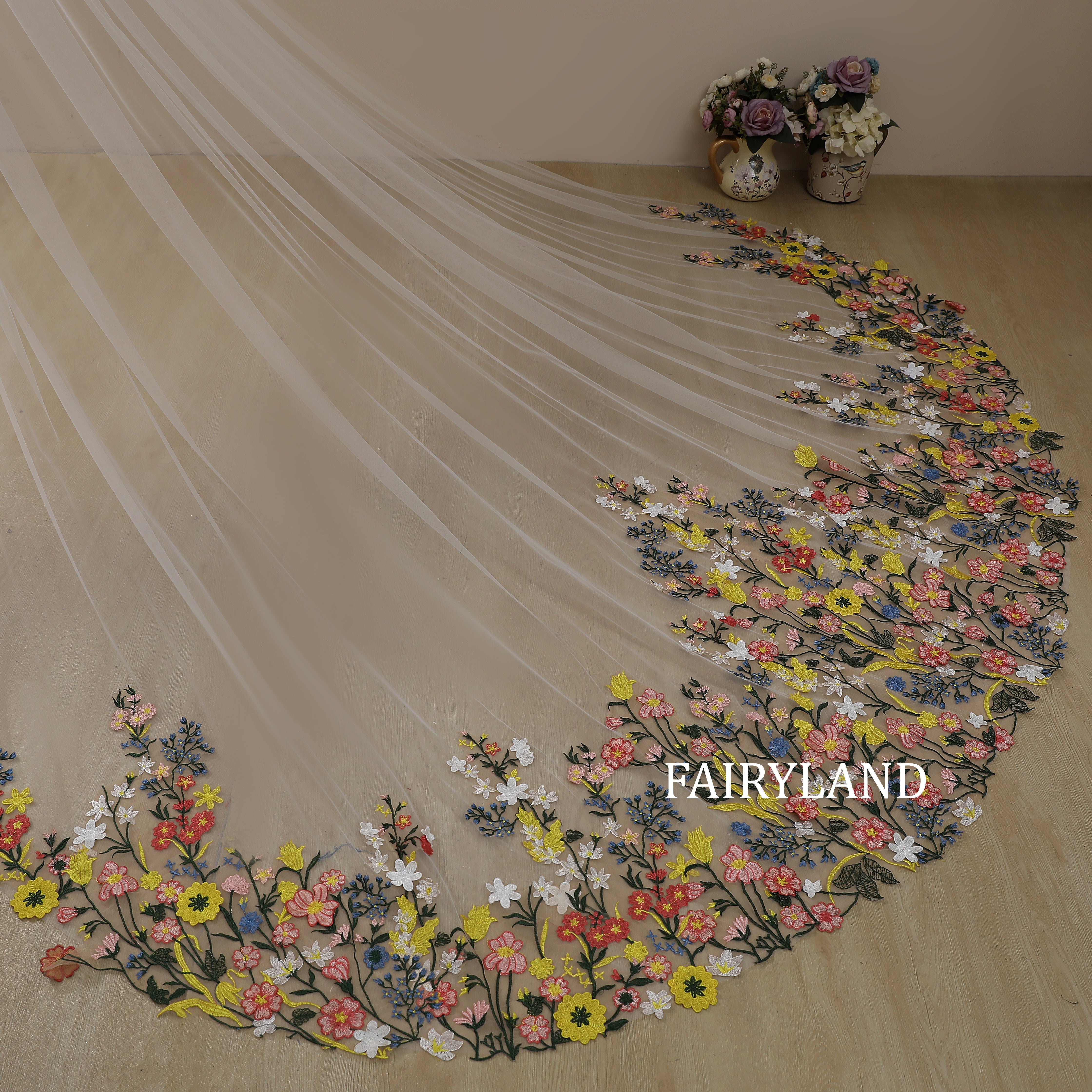 Step into a fairytale garden with this breathtaking cathedral-length wedding veil by FAIRYLAND. Crafted from lightweight soft tulle, this veil features exquisite multi-color floral embroidery that blooms gracefully along the edge, creating a romantic and artistic statement for your wedding day. The long flowing train adds a dreamy touch of elegance, perfect for brides who wish to blend timeless beauty with a hint of modern whimsy. Handmade with care and love, this floral embroidered veil will make your walk down the aisle unforgettable.