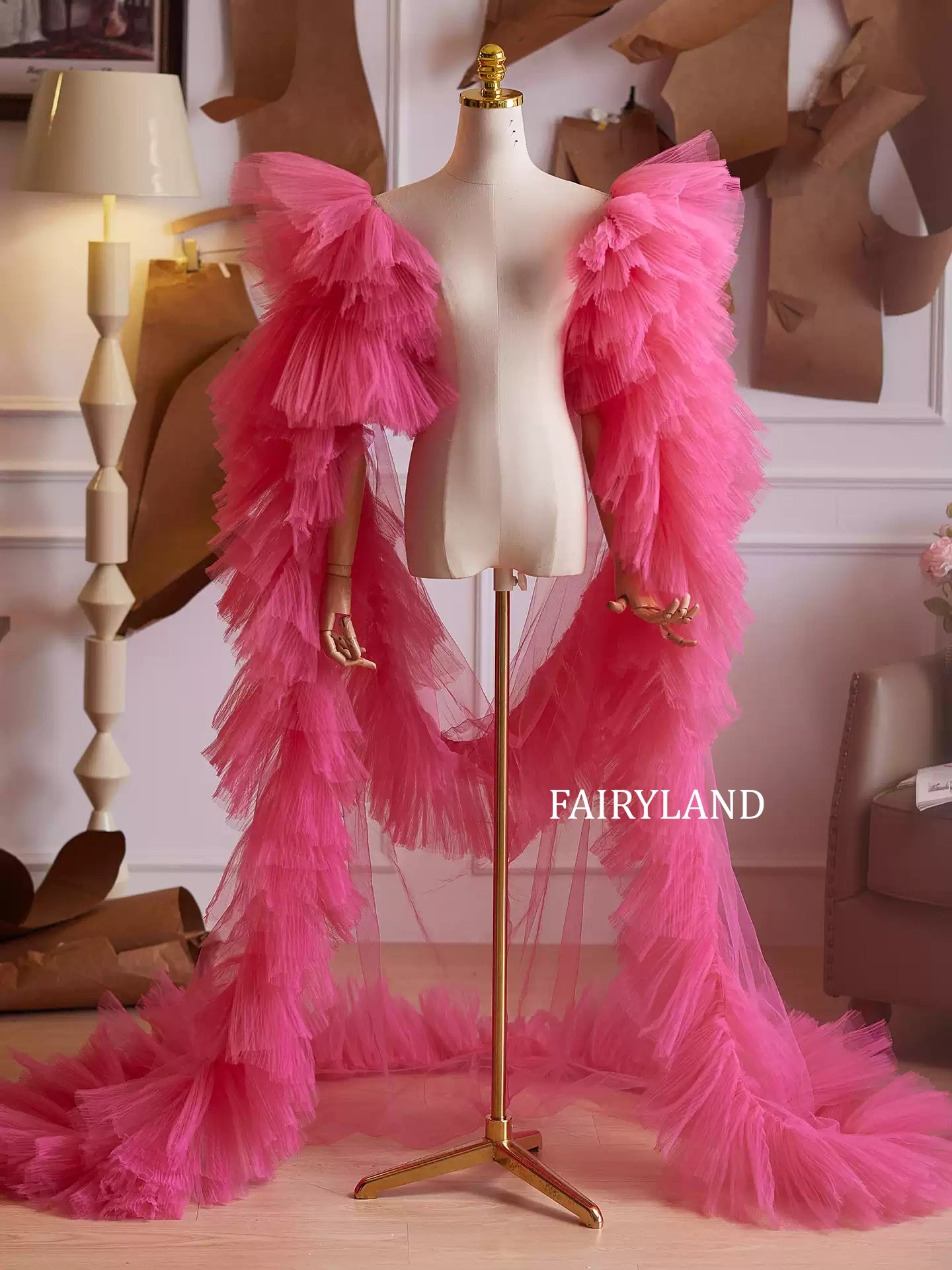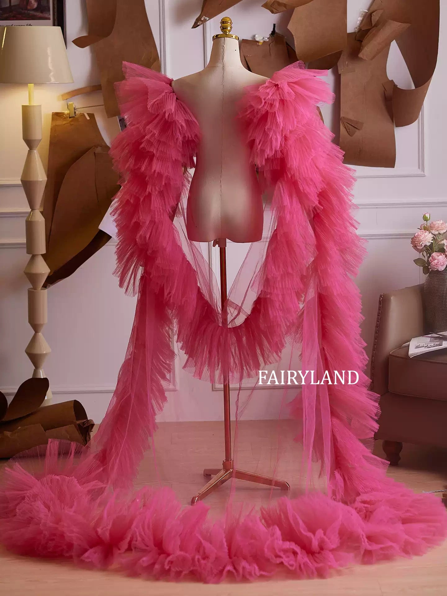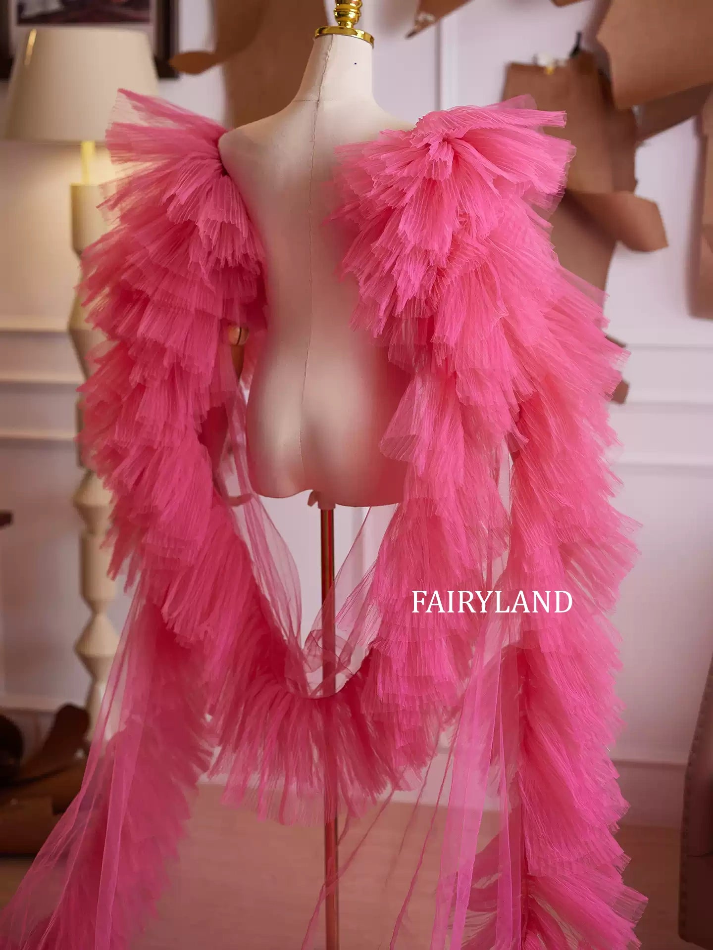 Turn every moment into a statement with this hot pink ruffled tulle cape. Crafted from layers of soft, voluminous tulle, this stunning piece adds a bold, high-fashion touch to your bridal or photoshoot look. The cascading train and dramatic ruffles create a show-stopping silhouette that exudes confidence and glamour.