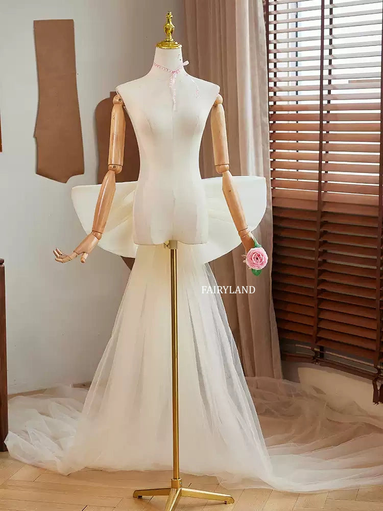 This breathtaking ivory tulle gown is designed to bring elegance and artistry to any bridal or editorial photoshoot. Featuring a dramatic sculpted oversized bow at the waist, the dress creates a stunning focal point that blends modern couture styling with soft romantic charm.
