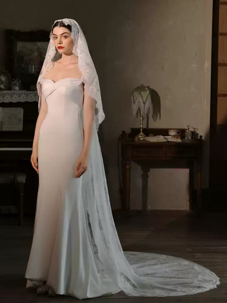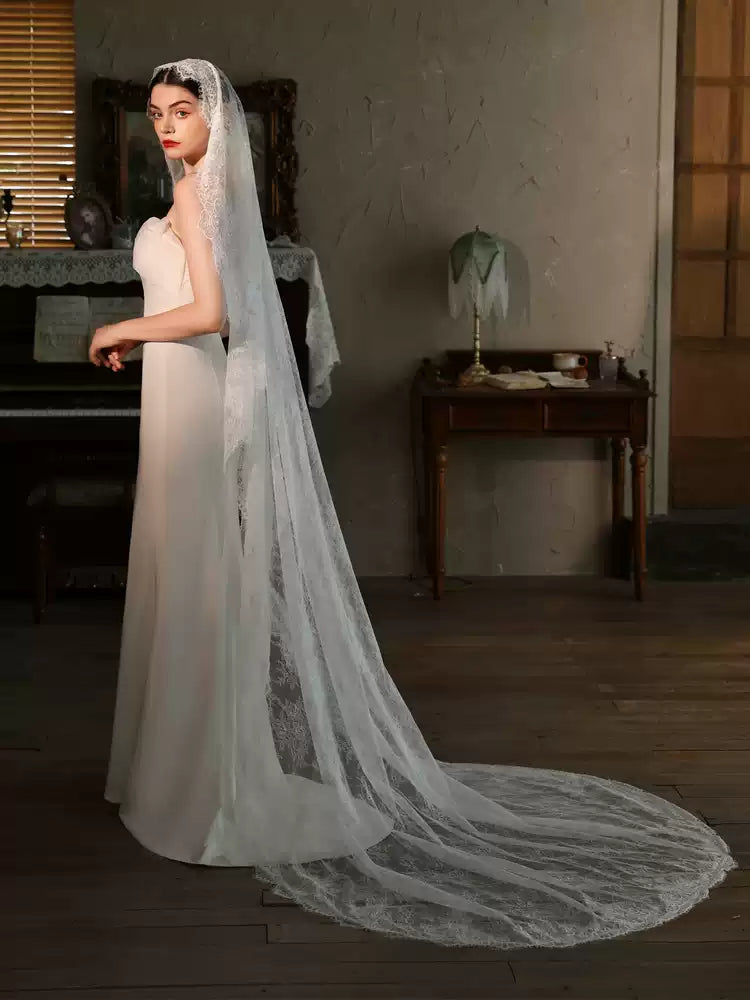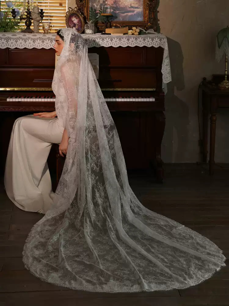 Elevate your bridal look with this elegant cathedral-length mantilla veil, featuring soft sheer tulle and a beautifully scalloped floral lace edge. Designed to drape gracefully over your shoulders and back, it creates a romantic, timeless silhouette perfect for classic, vintage, or modern weddings. Lightweight, photogenic, and effortlessly luxurious — the perfect finishing touch for your big day.