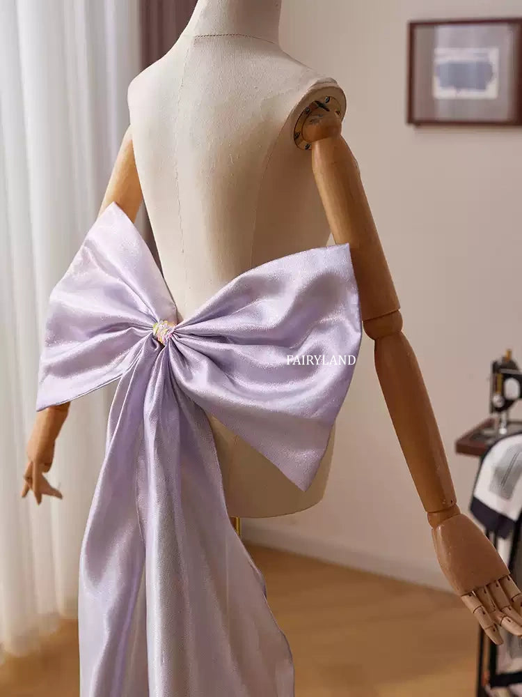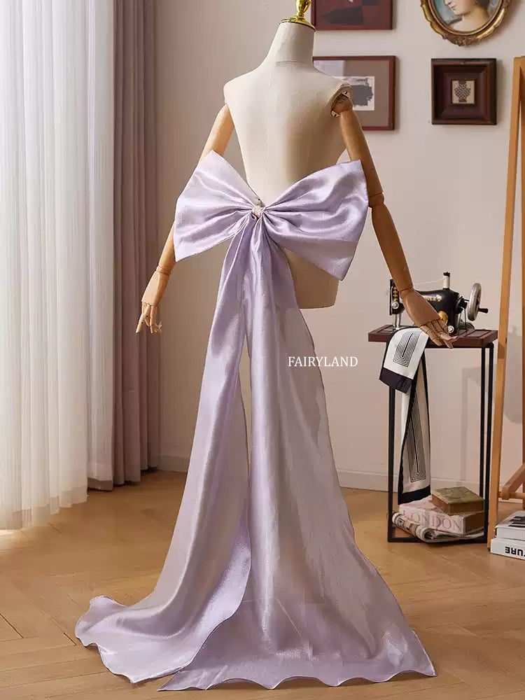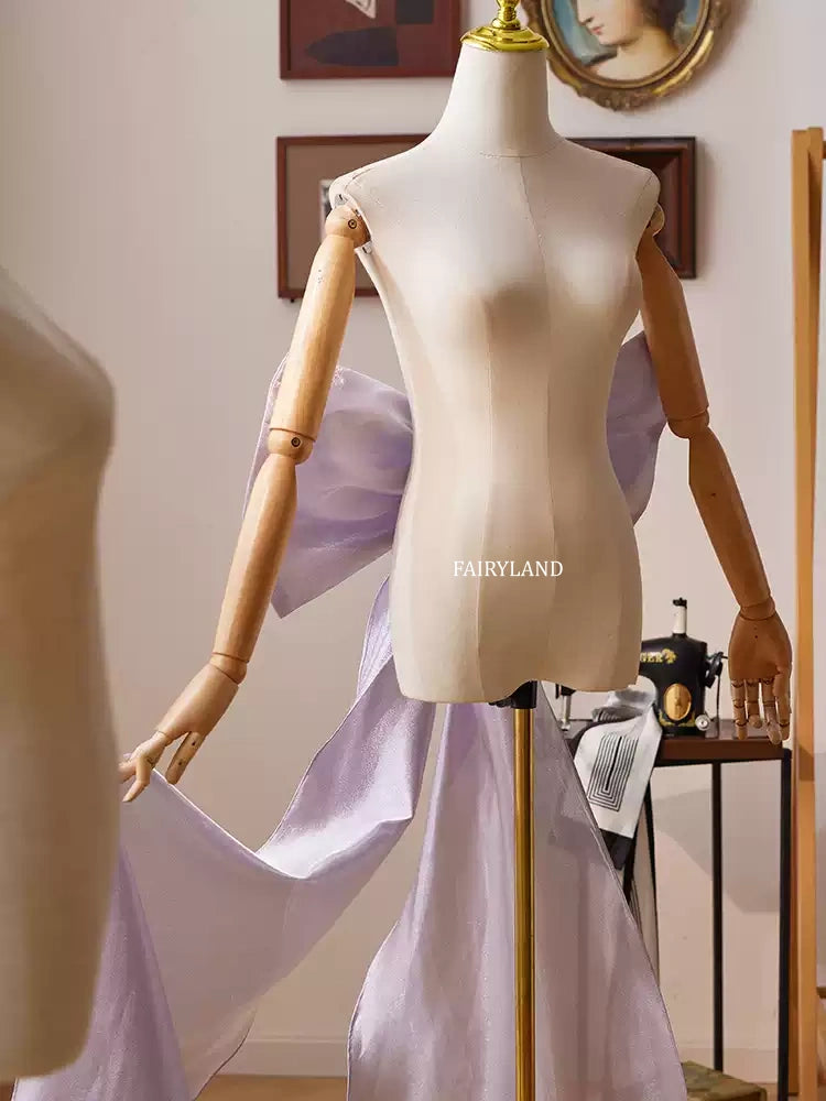 This ethereal lavender shimmer bow train is designed to elevate any bridal or editorial photoshoot with soft glamour and couture elegance. Featuring an oversized sculpted bow that sits beautifully at the back, the design flows into a long, fluid train that captures light and movement effortlessly.