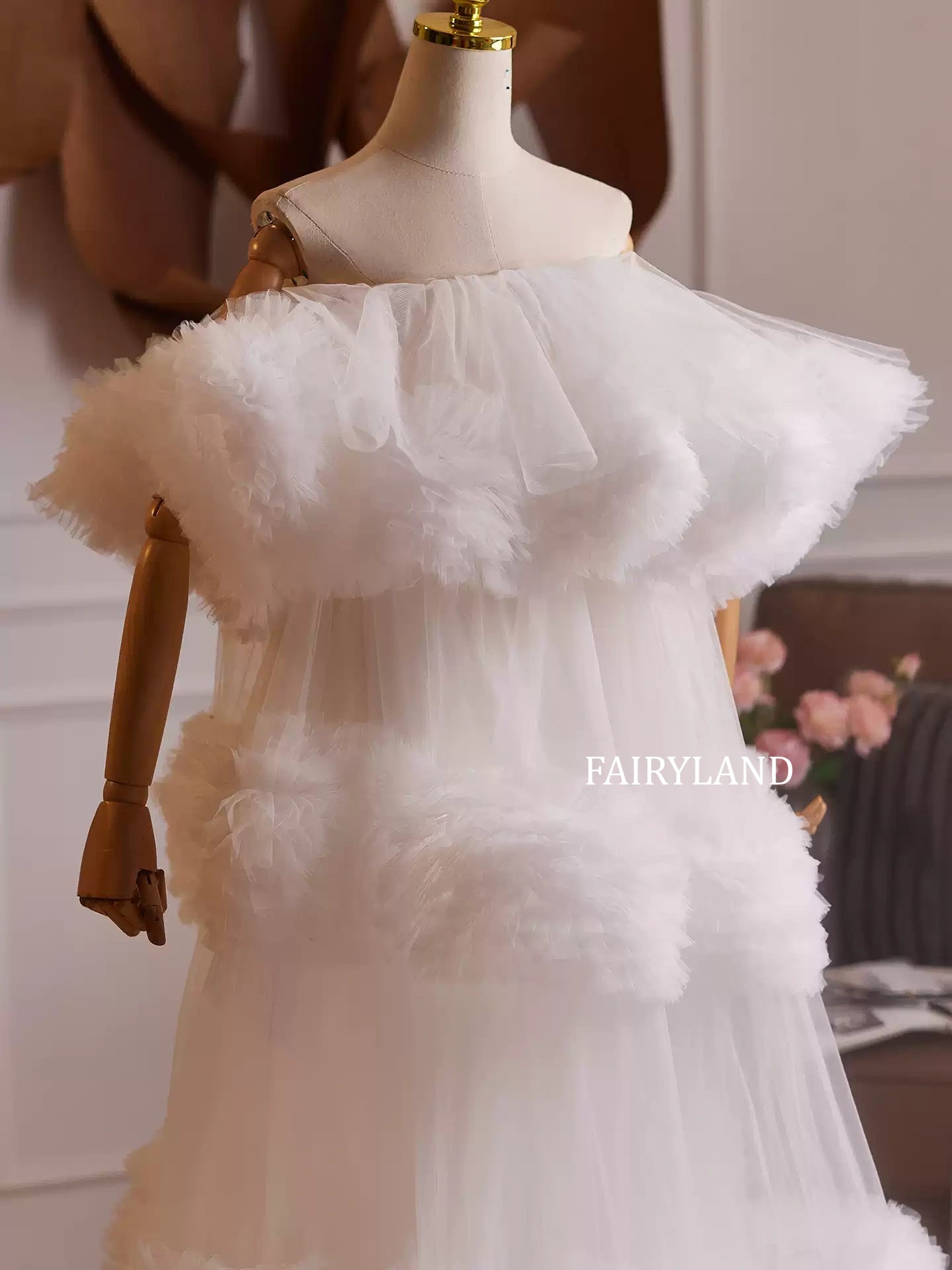 Crafted from soft white mesh, the skirt features three voluminous tiers of fluffy tulle that create a breathtaking silhouette β light, airy, and irresistibly romantic.