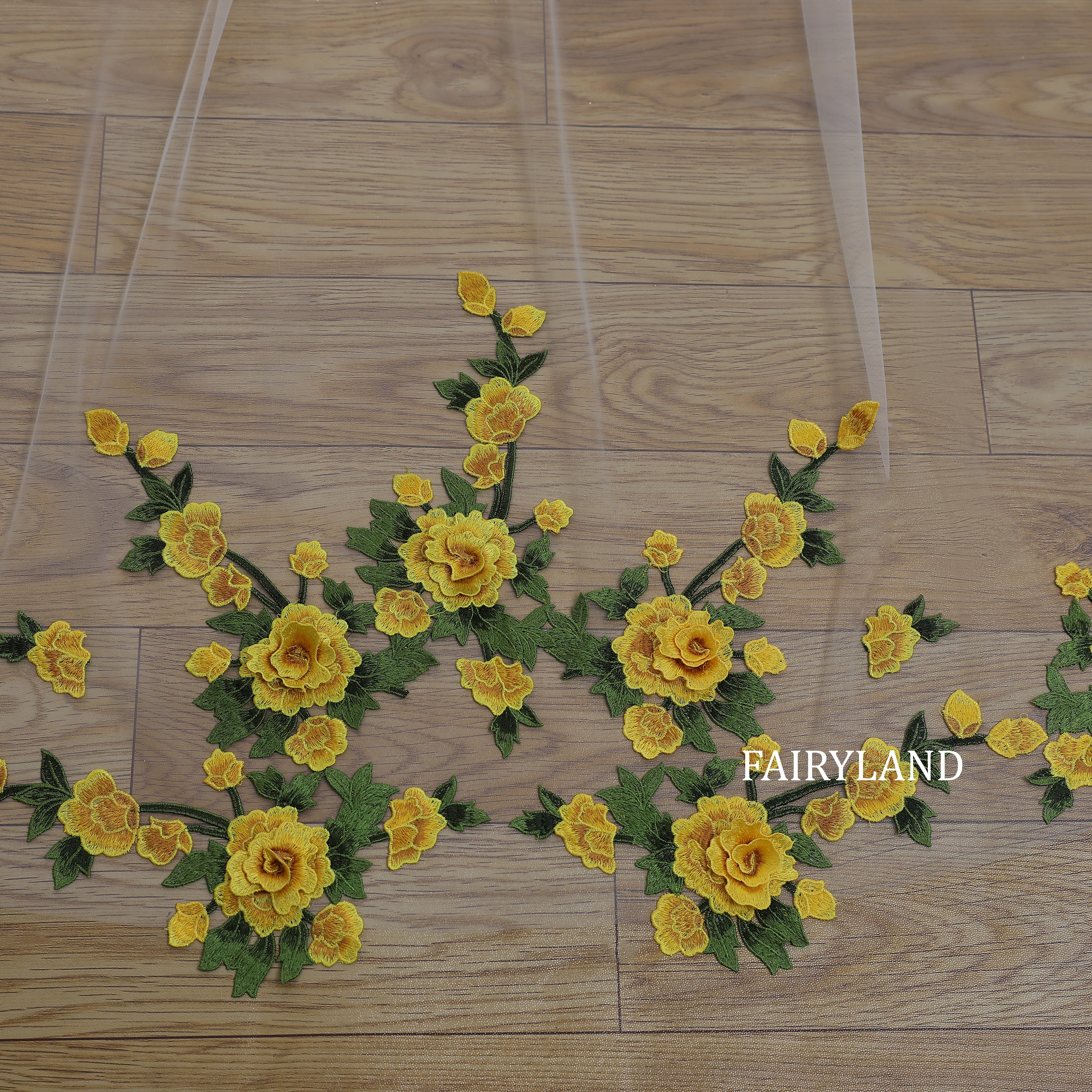 Crafted from soft, lightweight tulle, the veil features exquisite yellow floral embroidery along the edge — symbolizing joy, love, and new beginnings.