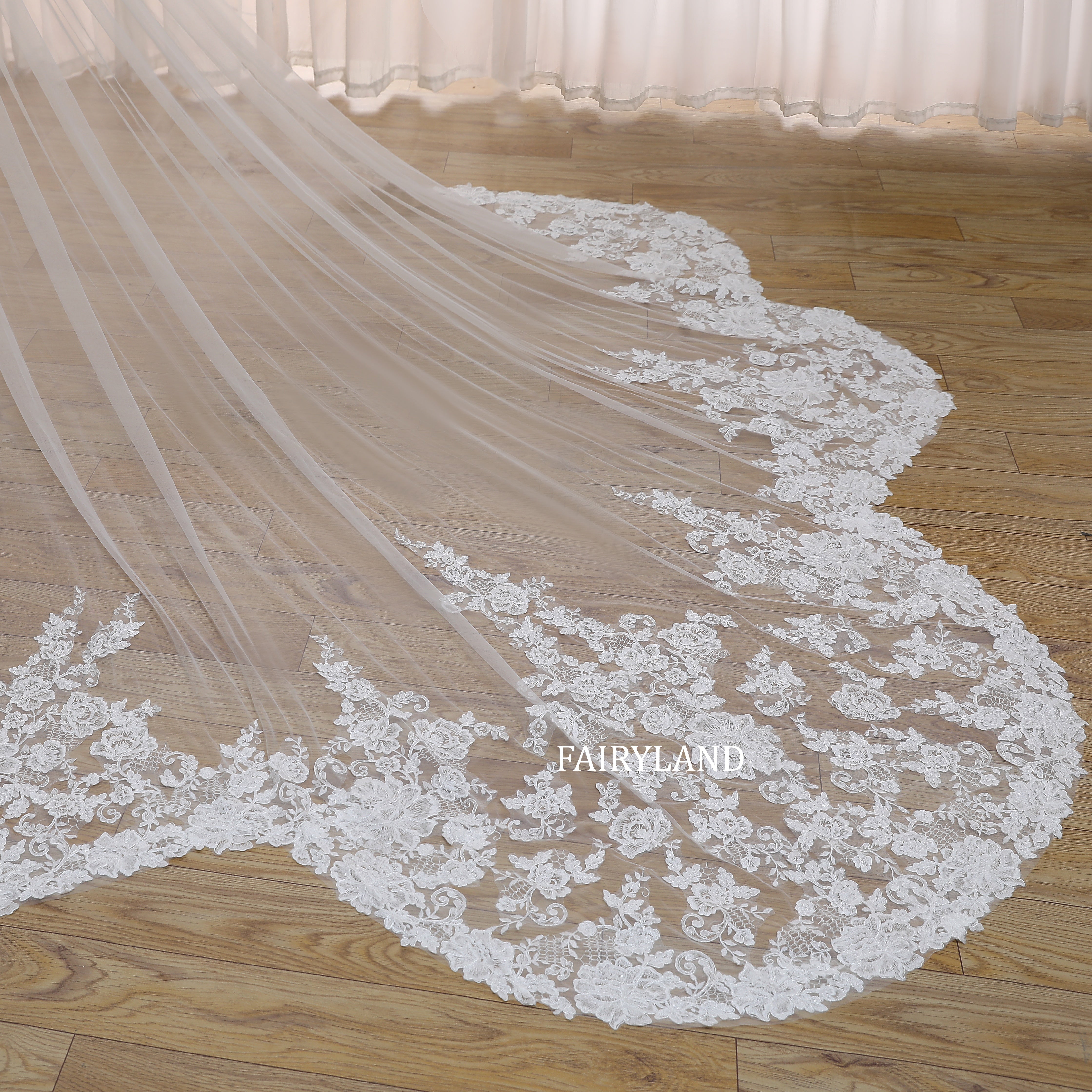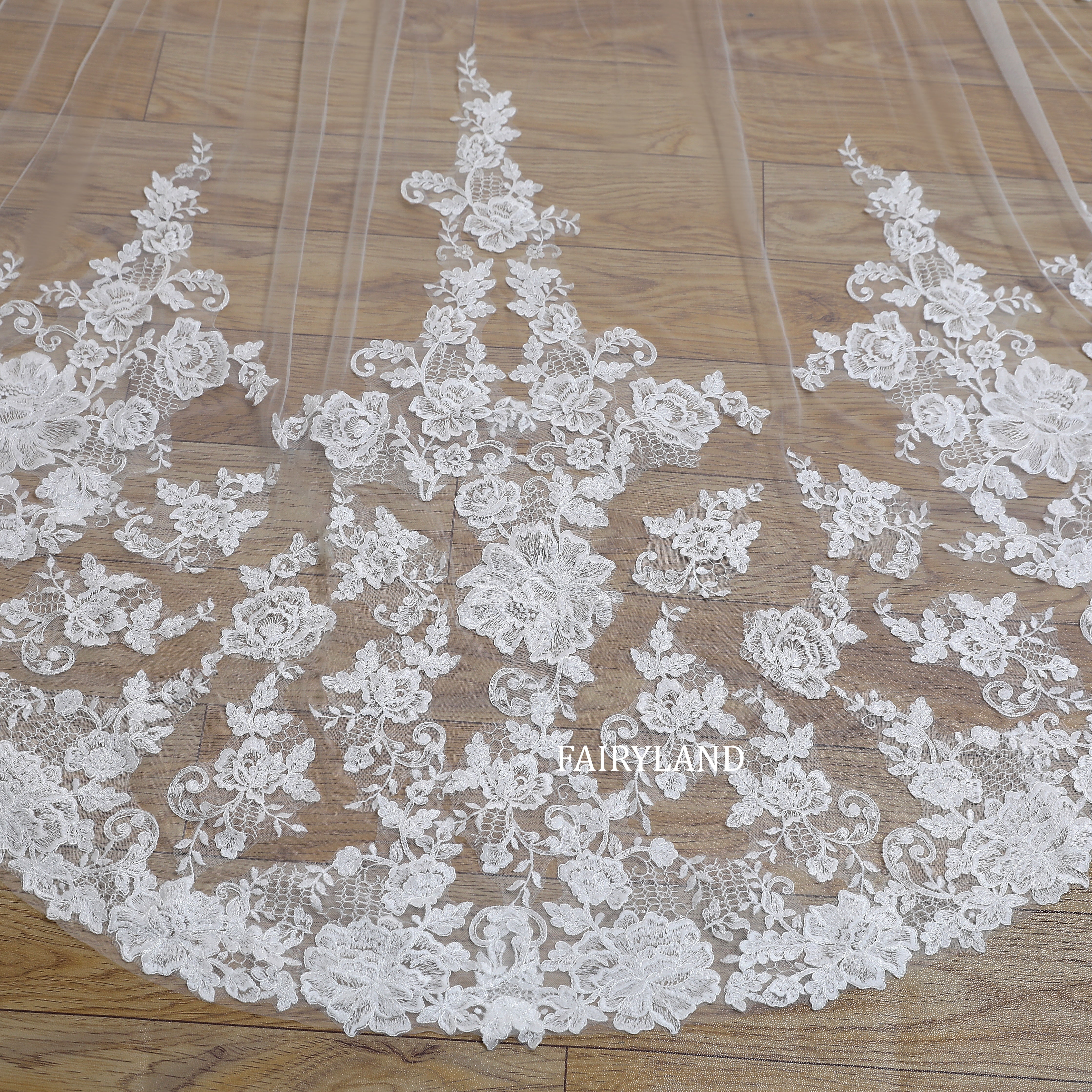 The veil is finished with delicate floral lace appliqué along the edge, adding romantic texture without overwhelming the gown. Lightweight and airy, it drapes beautifully and photographs flawlessly, making it perfect for church weddings, grand ceremonies, and formal bridal looks.