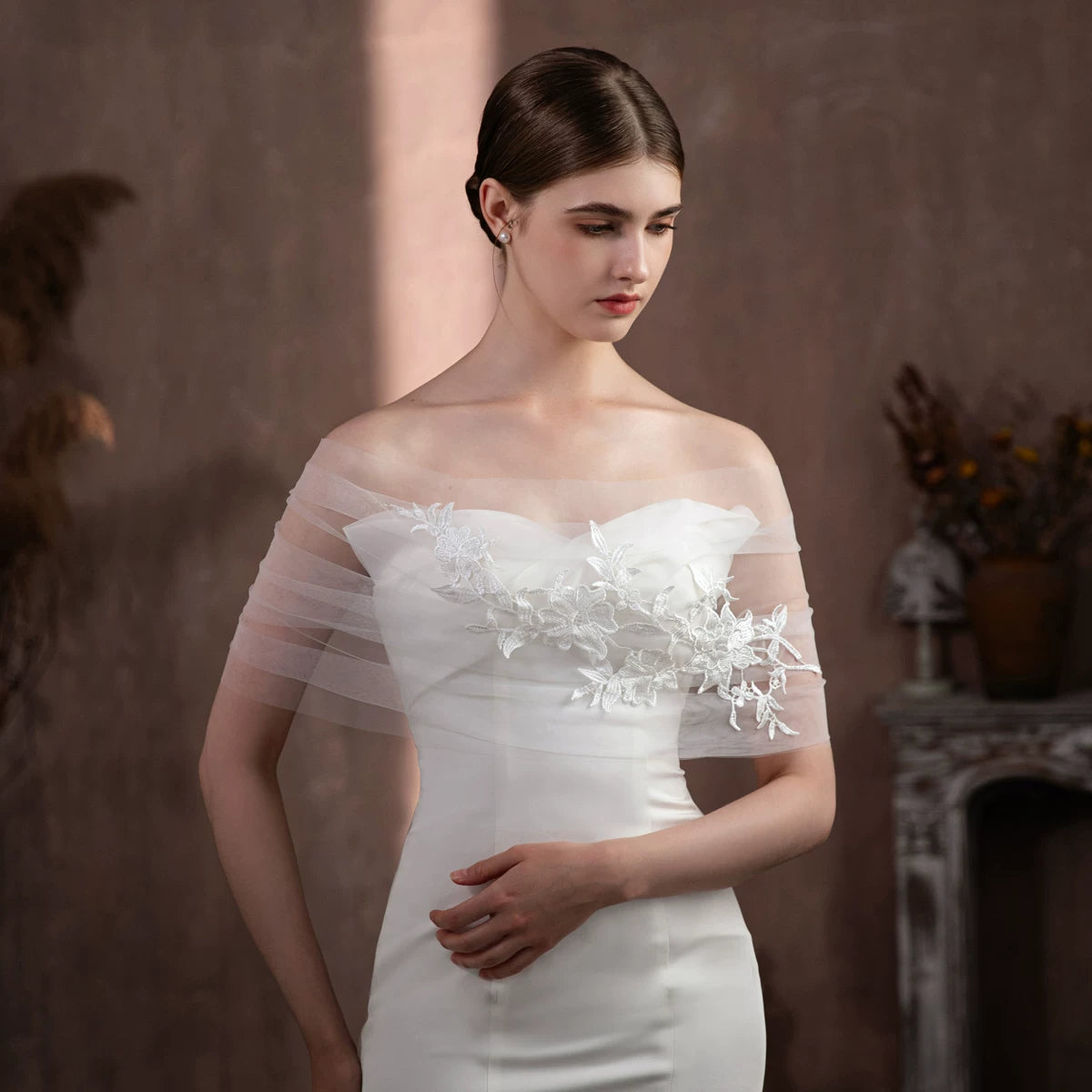 Elevate your bridal look with this elegant off-shoulder bridal wrap, crafted from soft sheer tulle and adorned with delicate 3D floral lace appliqué.
