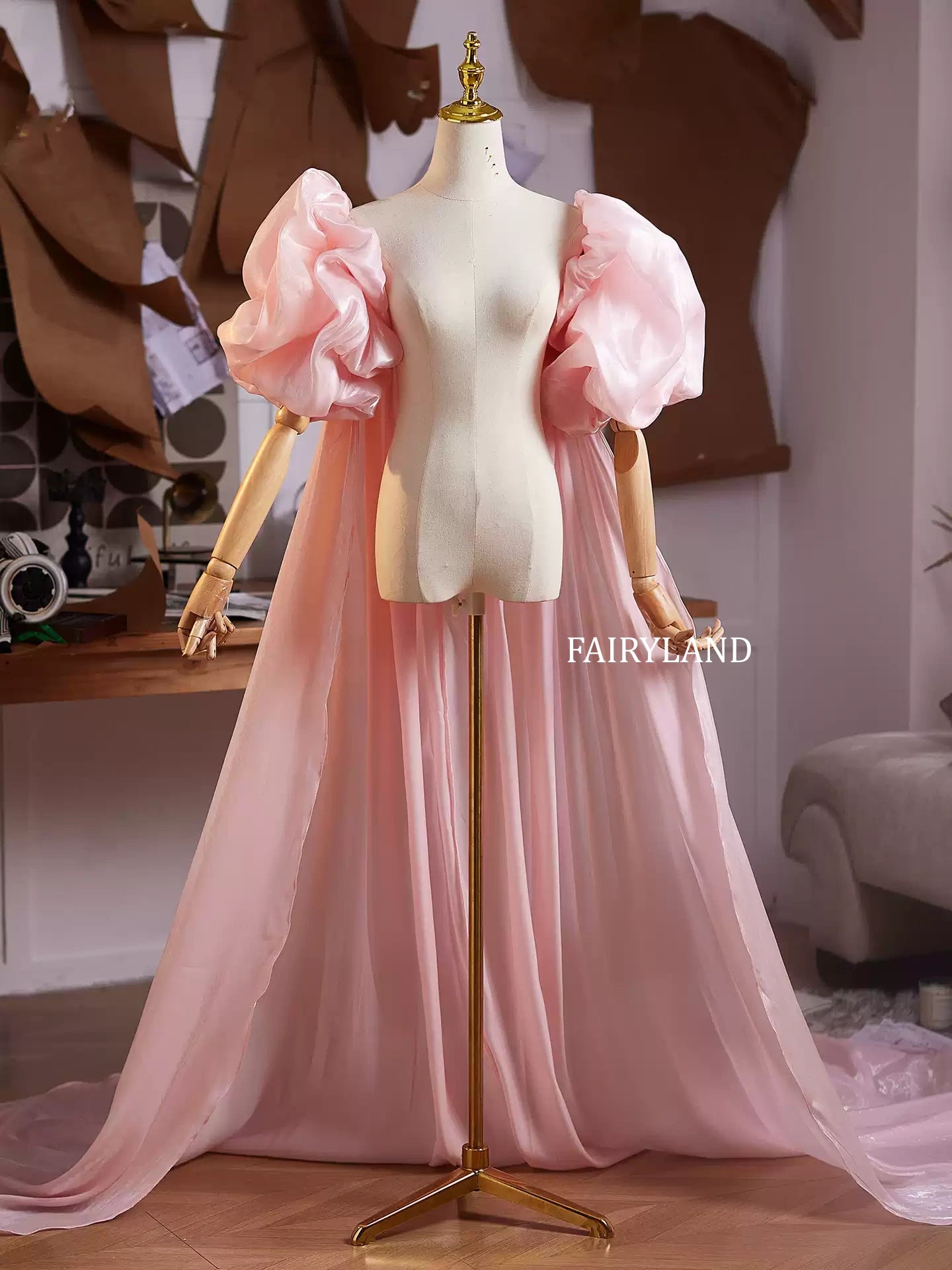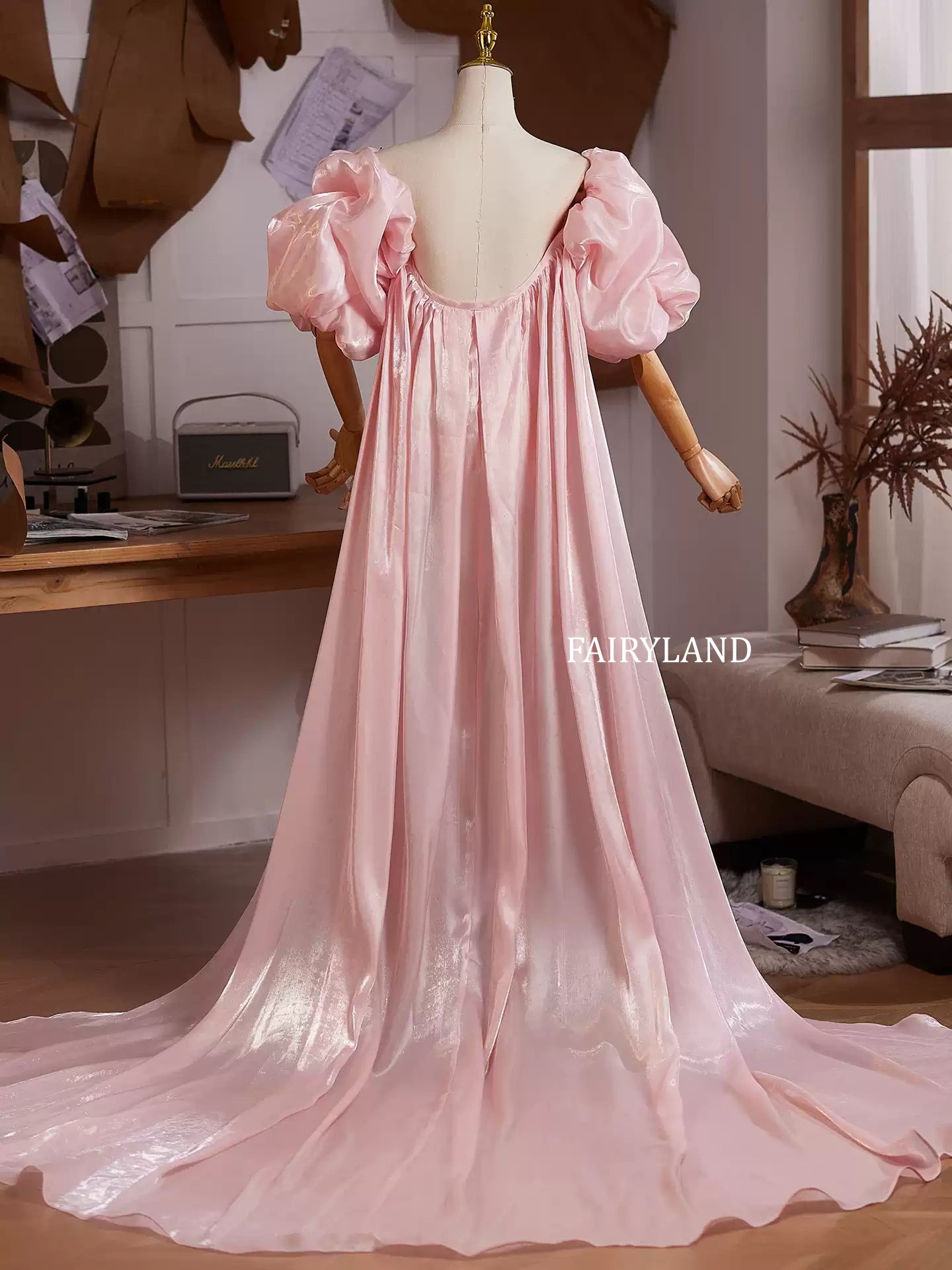 Make a breathtaking entrance with this luxurious pink satin gown, crafted for dreamers, brides, and muses. Designed with dramatic puff sleeves and an asymmetric one-shoulder neckline, this gown flows into a luminous draped train that catches every glimmer of light.