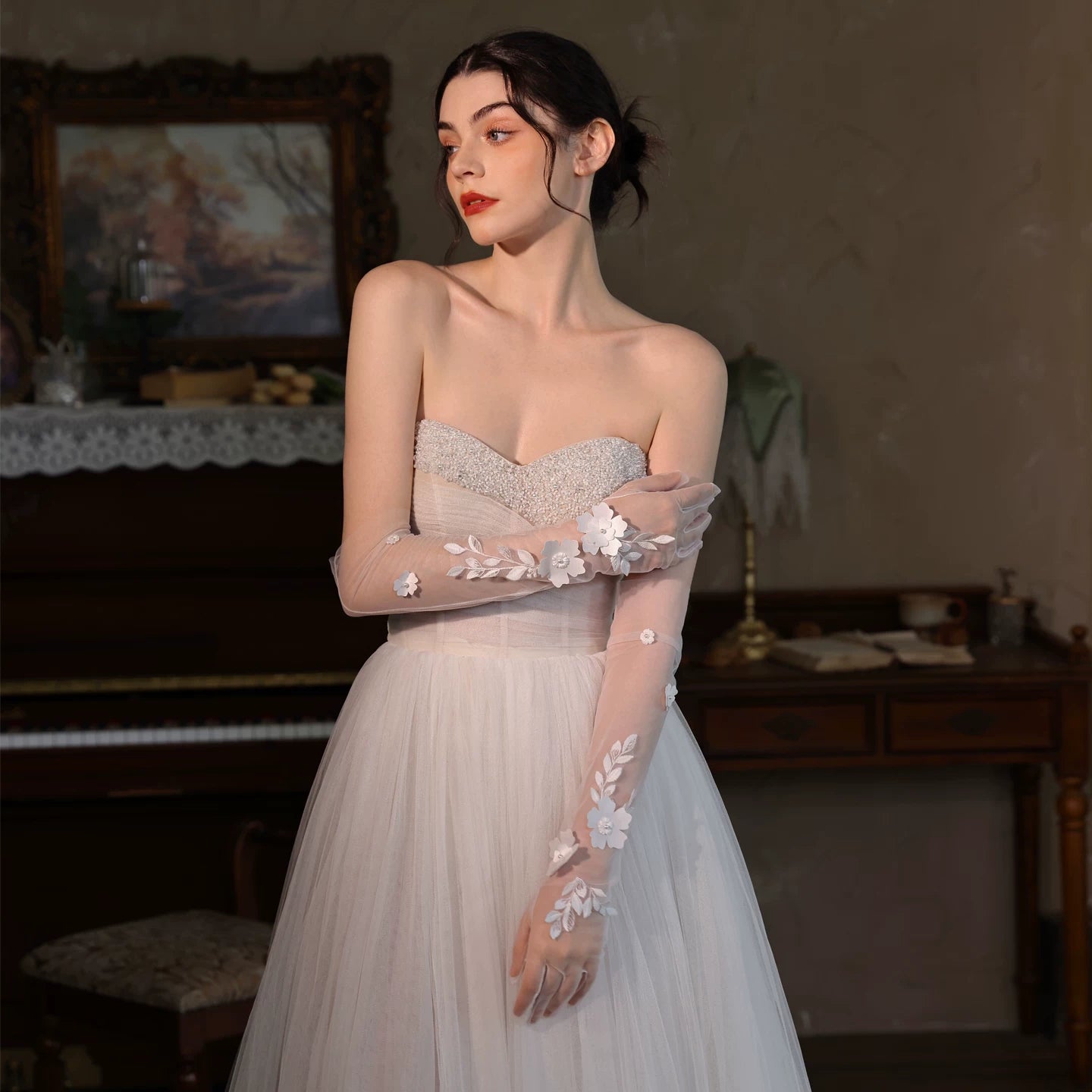 Designed to complement both classic and modern wedding gowns, the semi-transparent fabric softly hugs the hands while the embroidered flowers add a couture-inspired touch. Perfect for church ceremonies, luxury weddings, and bridal portraits, these gloves elevate your look without overpowering your dress.