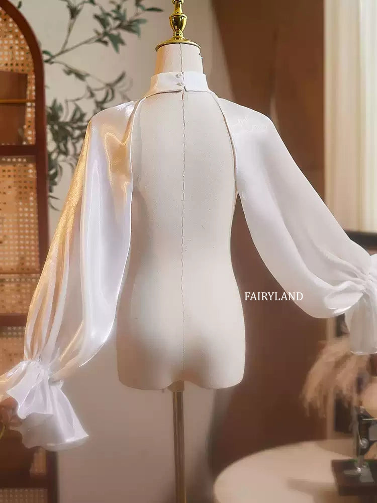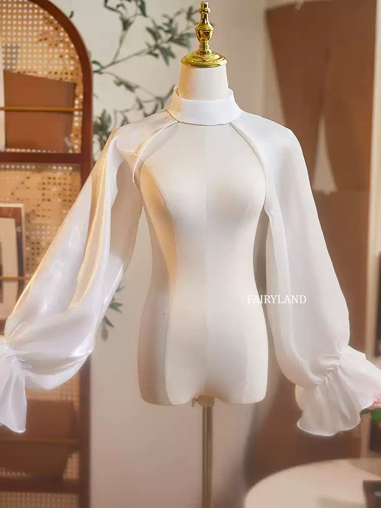 Elevate your bridal look with these ethereal sheer organza detachable sleeves, designed to add instant elegance and dreamy volume to any wedding gown. Featuring a refined high neckline and dramatic bishop sleeves that gather into soft ruffled cuffs, this piece transforms simple silhouettes into couture-inspired masterpieces.