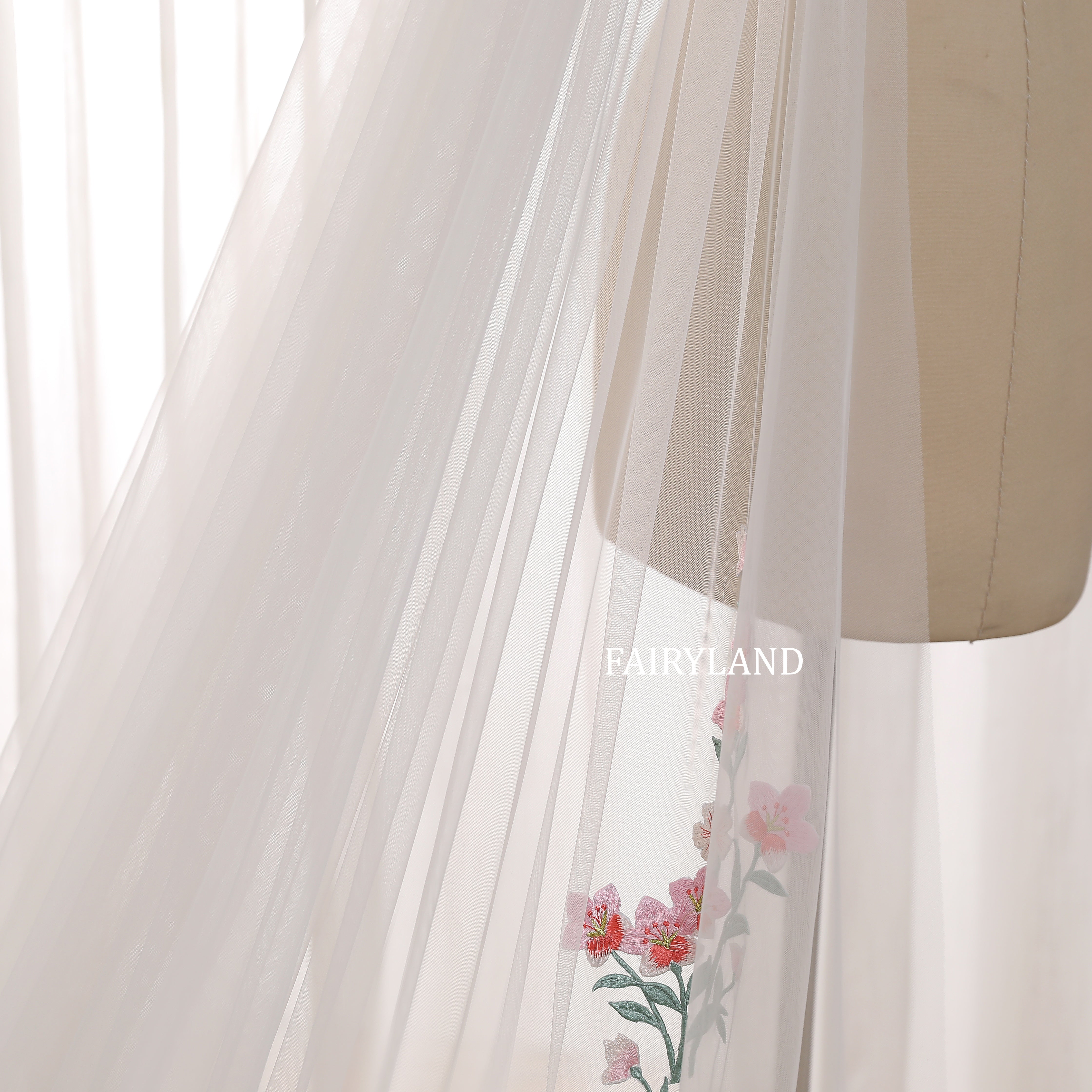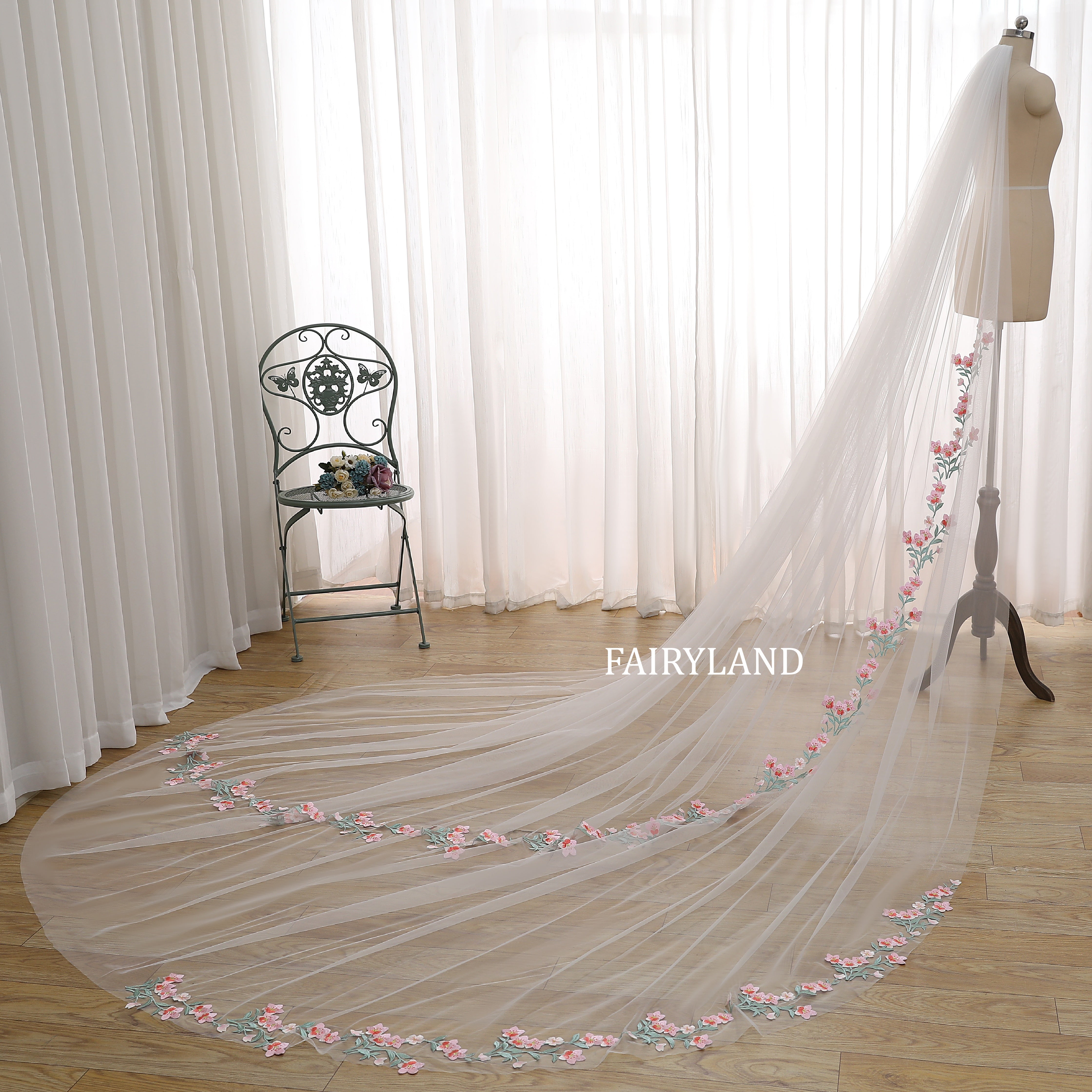 Add a romantic, fairy-tale touch to your bridal look with this stunning cathedral-length wedding veil. Made from ultra-soft, lightweight tulle, this veil flows beautifully and features exquisite pink floral embroidered appliqués along the entire edge. The 3D flower details create a dreamy, feminine finish—perfect for brides who want elegance with a unique pop of color.
